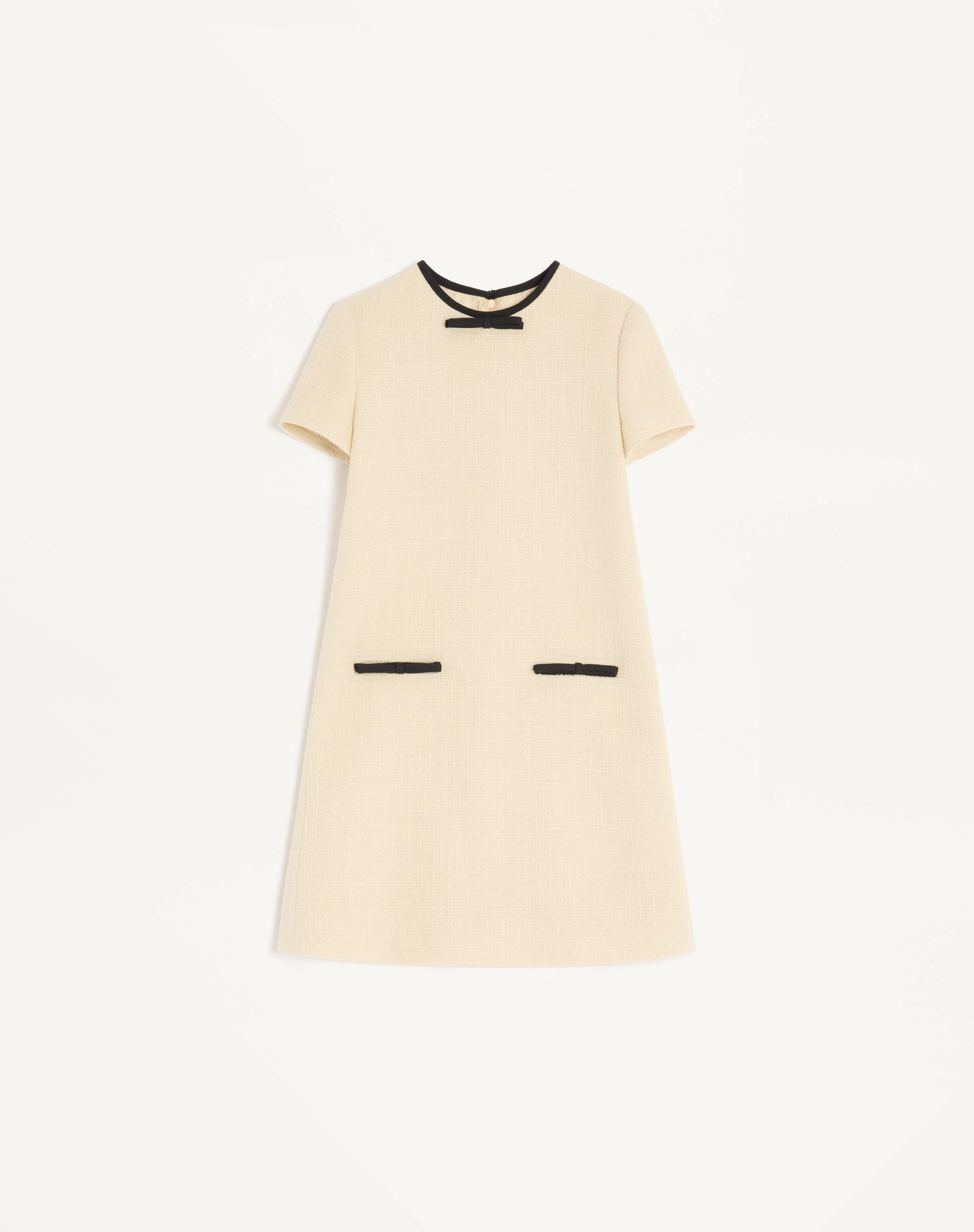 Short Dress in Plain Wool Tweed with contrasting bows in Crepe Couture - Rear zipper and hook-and-eye closure - Plain Wool Tweed (97% Virgin Wool, 3% Polyamide) - Lining with Flowers, Stripes, and VLogo (74% Acetate, 26% Silk) - Length: 90 cm / 35.4 in. from the waist in an Italian size 40 - The model is 176 cm / 5'9" tall and wears an Italian size 40 - Made in Italy The look of the model is completed by a Valentino Garavani Hoboho Bag and Valentino Garavani Snowish Shoes. Product code: 7B0VAH5090Y_DNG