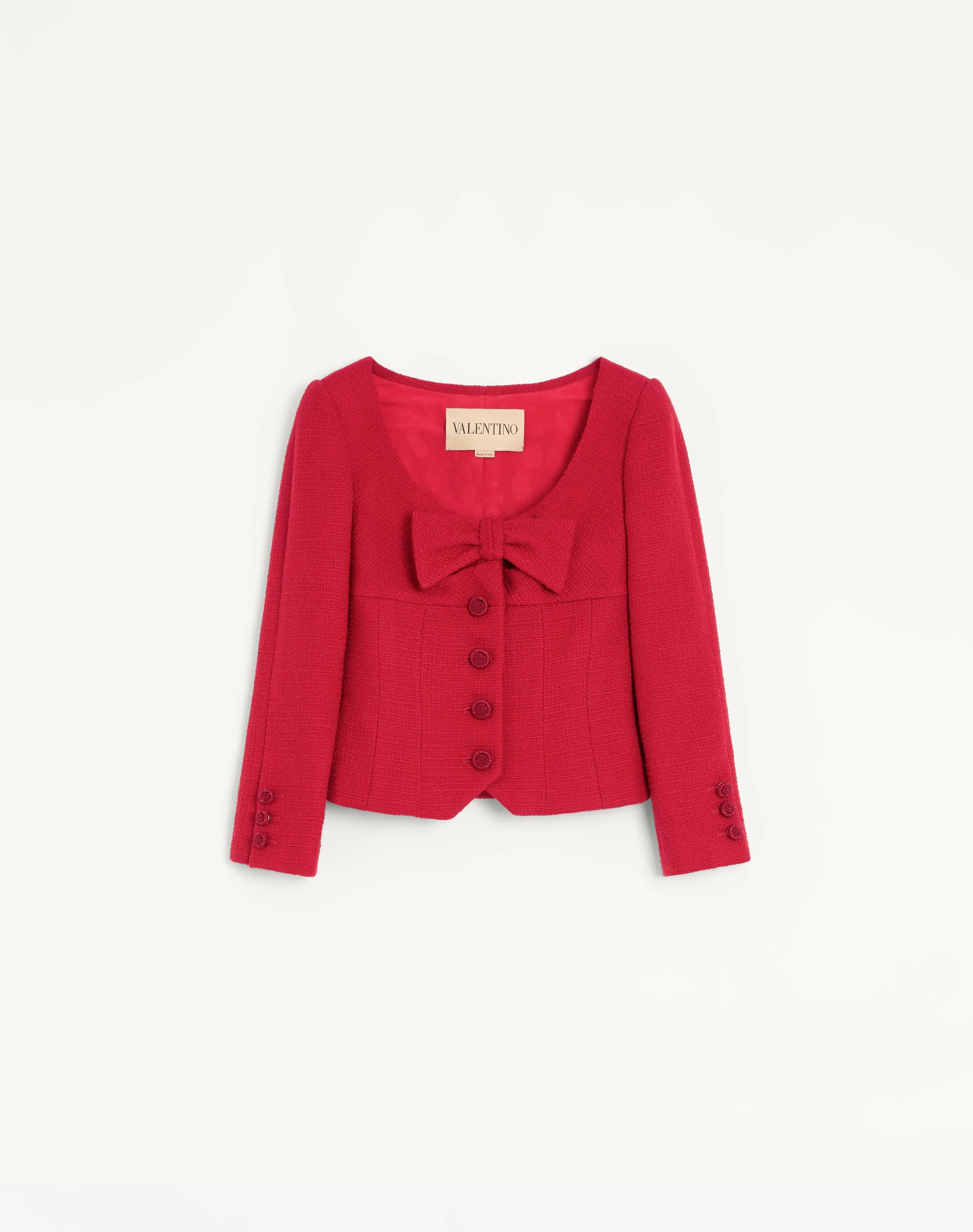 Plain Wool Tweed Short Jacket with bow - Wide neckline - Soutache front button closure - Plain Wool Tweed (97% Virgin Wool, 3% Polyamide) - Lining with Flowers, Stripes and VLogo (74% Acetate, 26% Silk) - Length: 51.5 cm / 20.3 in. from the shoulders in an Italian size 40 - The model is 176 cm / 5'9" tall and wears an Italian size 40 - Made in Italy The look of the model is completed by a Valentino Garavani Panthea Bag and Valentino Garavani Valentino Garavani And Vans Shoes. Product code: 7B0CE4X590Y_R9M