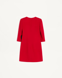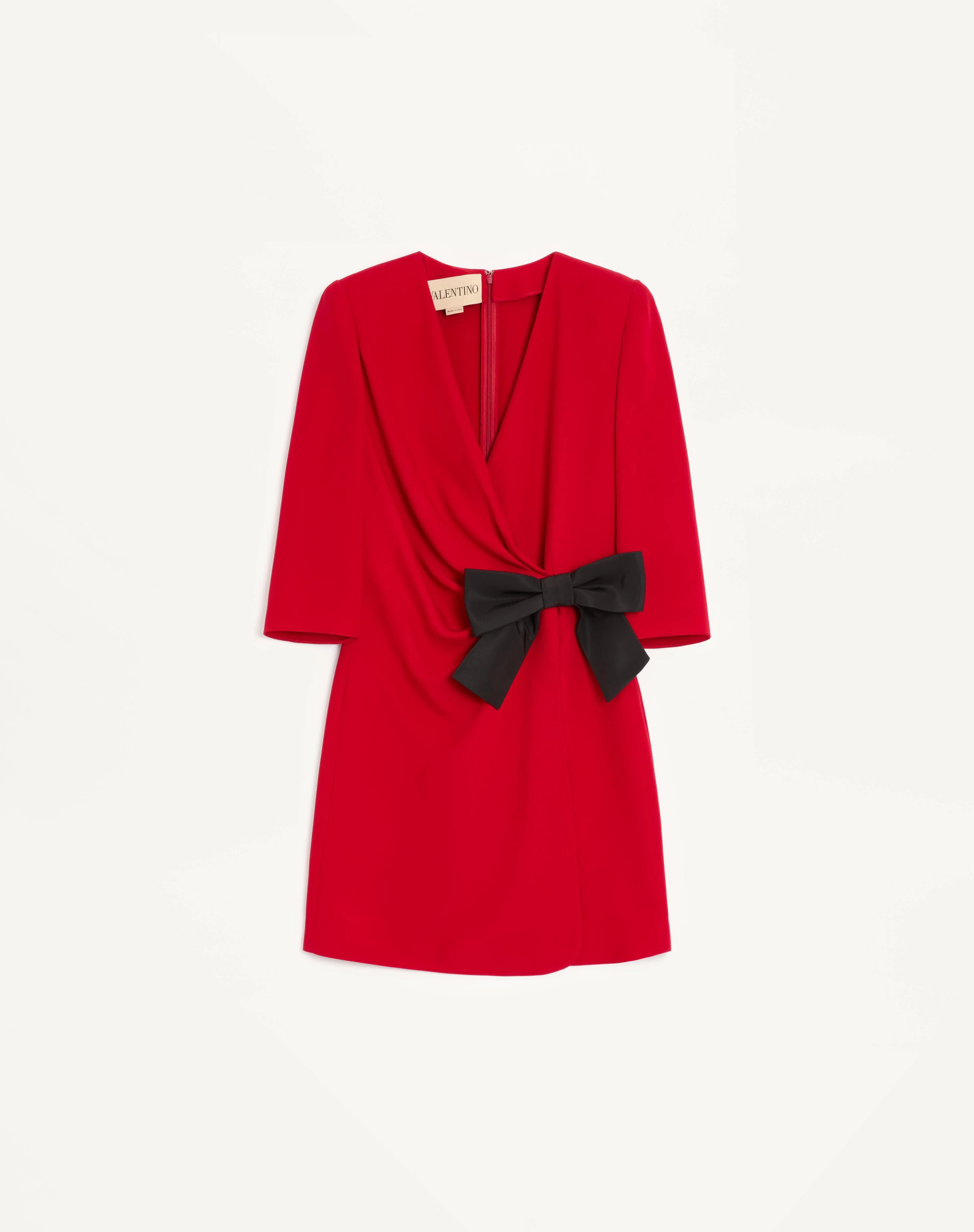 Cady Couture short dress with Faille bow - Ruching detail at the waist - Back zipper and hook-and-eye closure - Cady Couture (100% Silk) - Georgette Stretch Viscose lining (91% Viscose, 9% Elastane) - Length: 90 cm / 35.4 in. from the shoulders in an Italian size 40 - The model is 176 cm / 5'9" tall and wears an Italian size 40 - Made in Italy The look of the model is completed by Valentino Garavani Fetishique Shoes. Product code: 7B0VAGG71MM_9QK