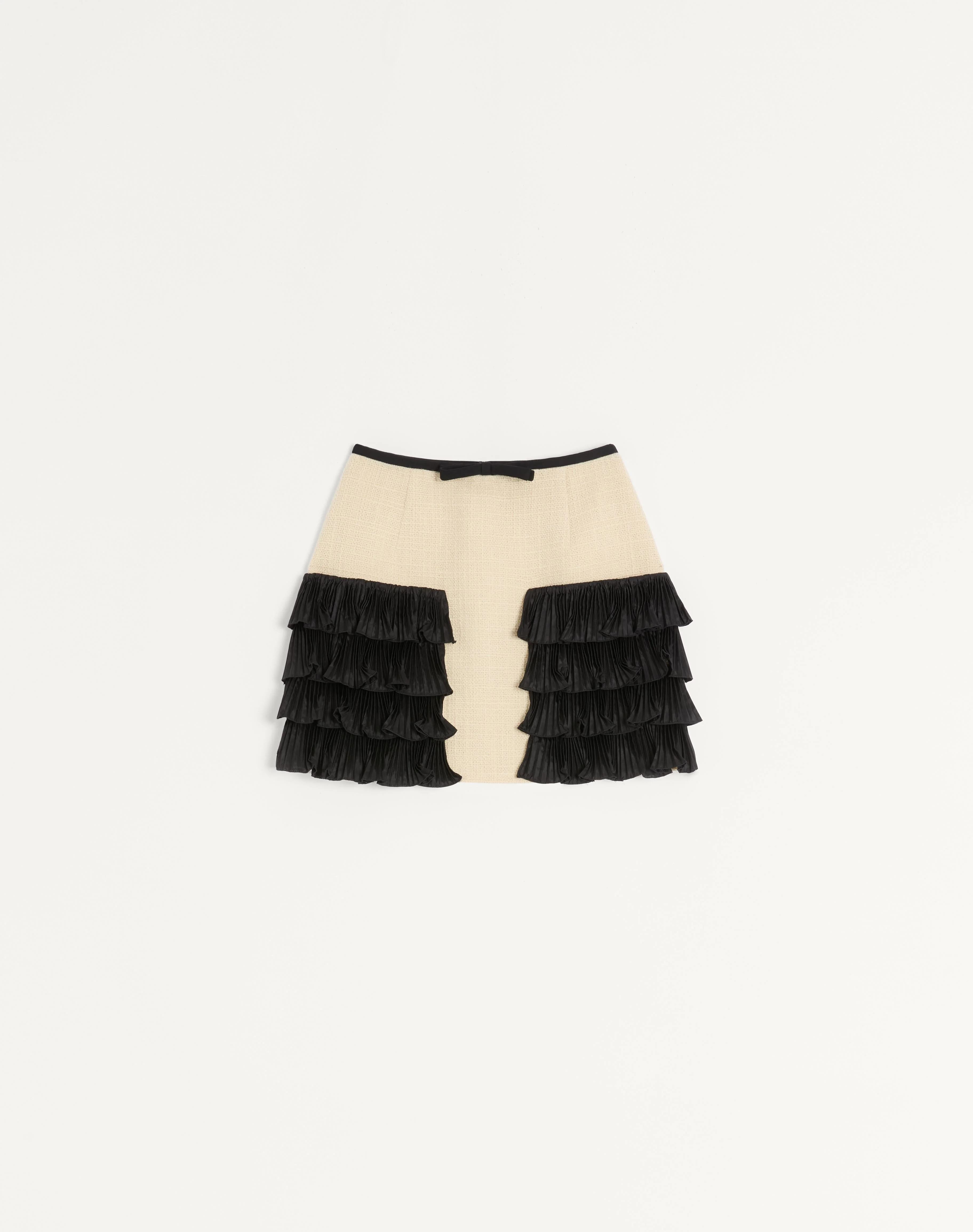 Plain Wool Tweed short skirt with pleated ruffles in Taffeta - Crepe Couture belt and bow - Rear zipper and hook-and-eye closure - Plain Wool Tweed (97% Virgin Wool, 3% Polyamide) - Lining with Flowers, Stripes, and VLogo (74% Acetate, 26% Silk) - Length: 85 cm / 34.3 in. from the waist in an Italian size 40 - The model is 176 cm / 5'9" tall and wears an Italian size 40 - Made in Italy The look of the model is completed by a Valentino Garavani Vain Bag and Valentino Garavani Dans Le Foyer Shoes. Product code: 7B0RADX190Y_DNG