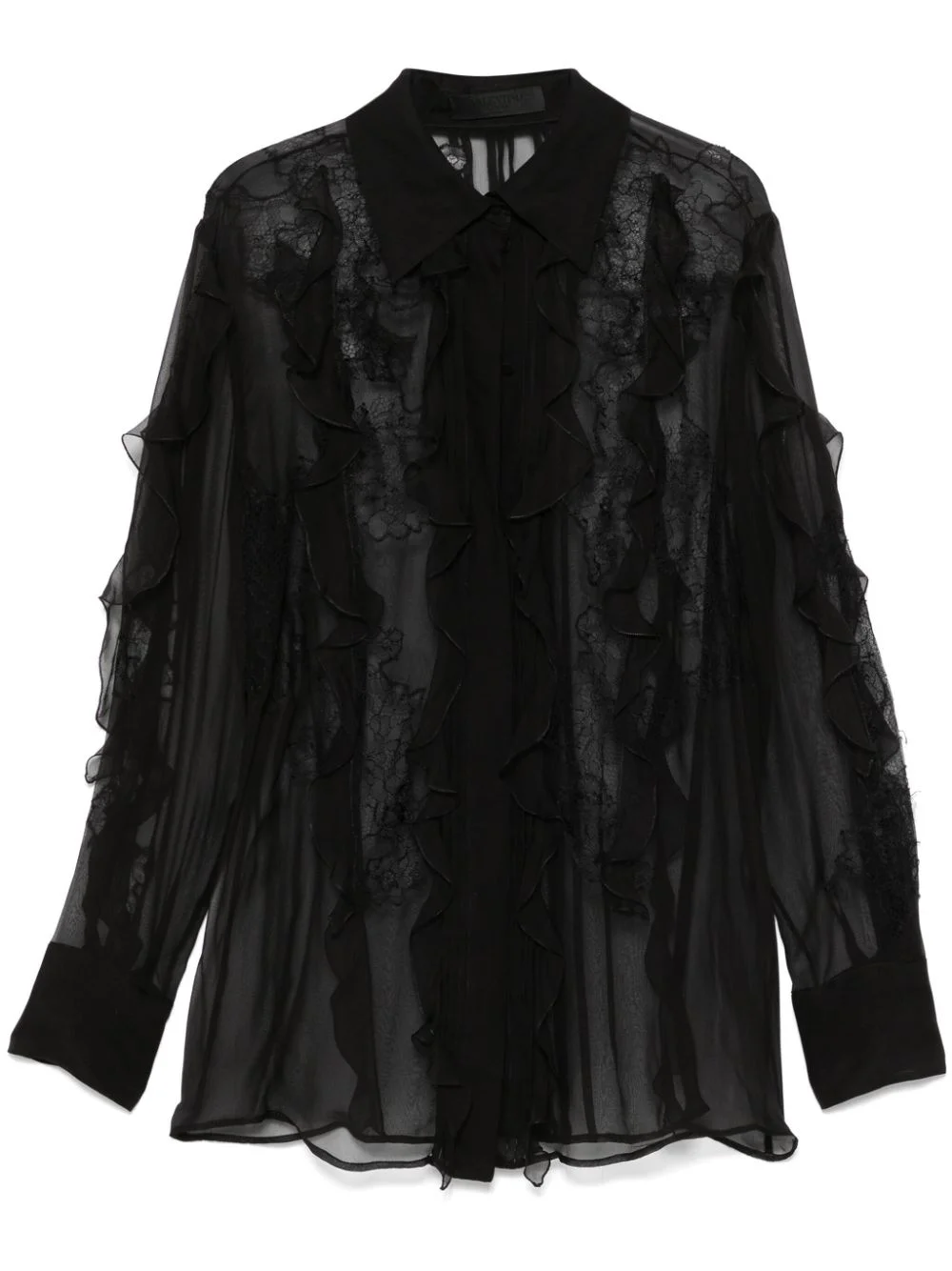 floral-embroidered blouse Highlights - Black - Silk - Sheer - Floral embroidery - Concealed front button fastening - Ruffled trim - Classic collar - Long sleeves - Buttoned cuffs - Curved hem Made in Italy Composition Silk 100%, Polyamide 65%, Viscose 35% SIZE & FIT Model measurements Height 5 ft 10 in(1.77 m) Bust/Chest 32.28 in(82 cm) Hips 35.03 in(89 cm) Waist 25.19 in(64 cm) FittingInformation Designed to be unstructured, offering a loose fit throughout Made from a lightweight non-stretch fabric
