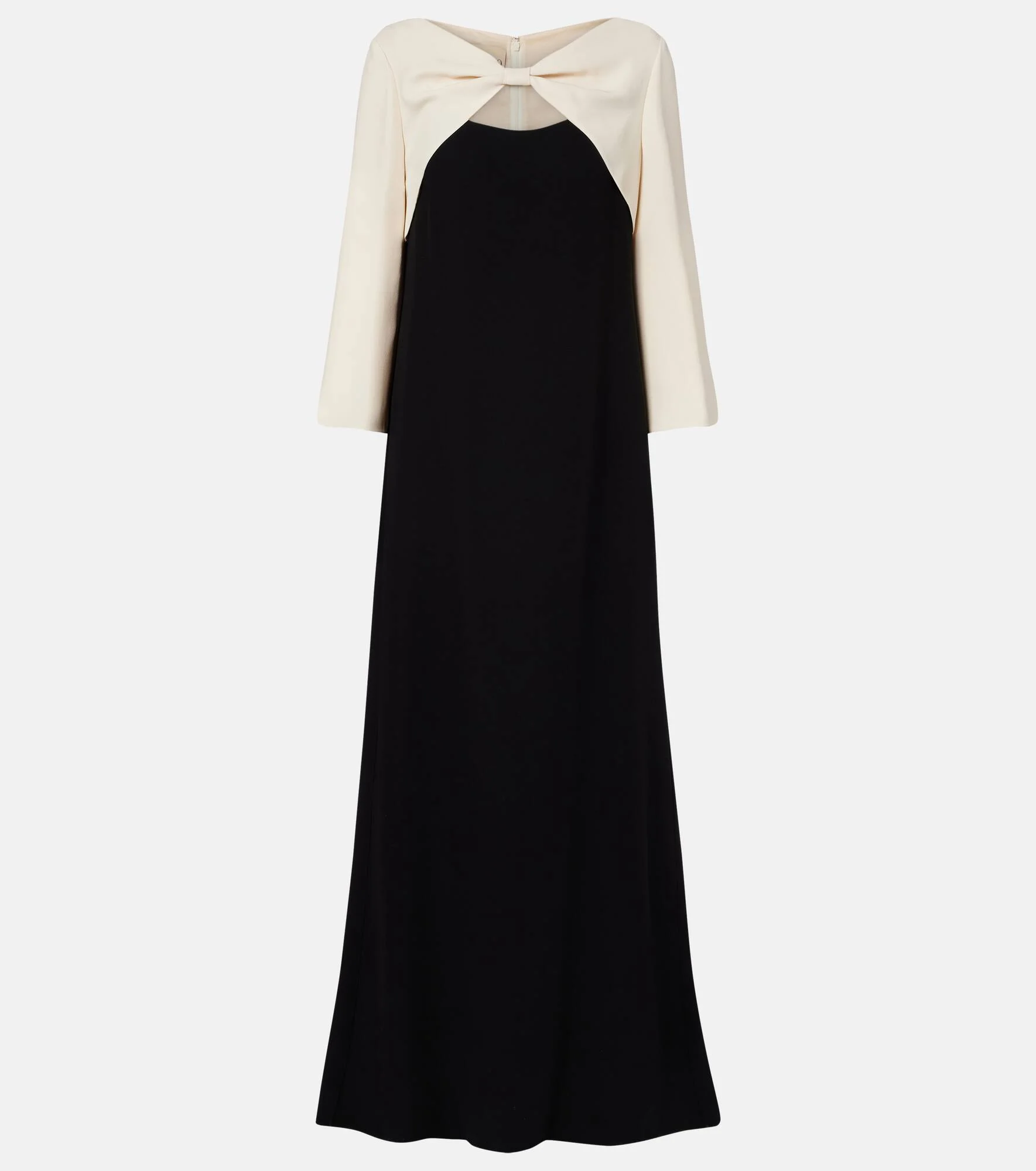 Valentino has become a symbol of crafting excellence, creativity, and uniqueness. This gown is expertly made in Italy from pure silk, and its column silhouette is elevated by a contrasting bodice with a central knot. Product Details - Material: 100% silk - Care instructions: dry clean - Made in Italy - Color: black - Designer color name: Nero/Vaniglia - Lining: 91% viscose, 9% elastane - Closure: concealed zipped back - Item number: P01108319 Size & Fit - True to size - Straight fit - Non-stretchy fabric - The model seen in the picture is 178cm-5'10" and wearing a size IT 40