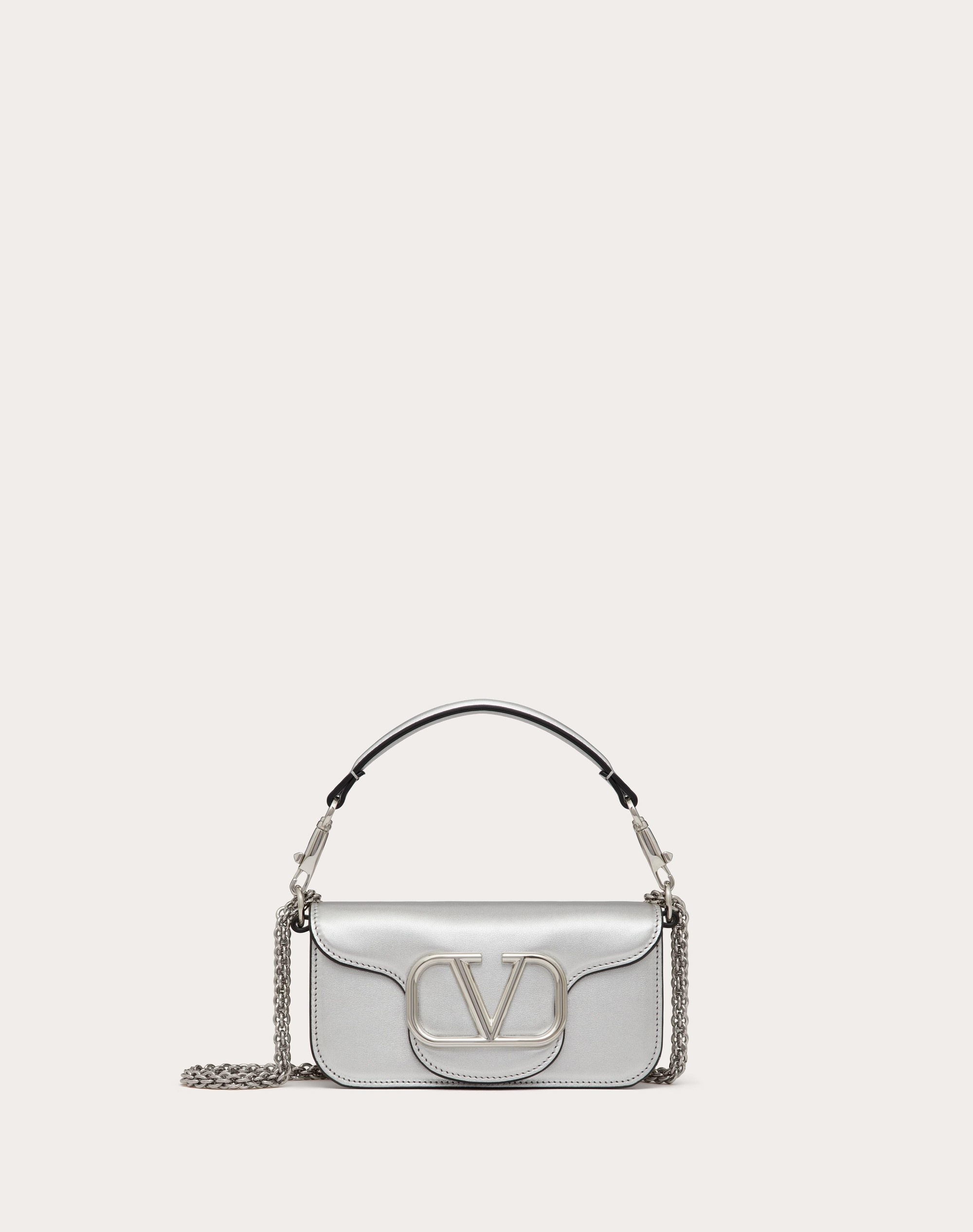 Valentino Garavani Loco small shoulder bag in metallic calfskin leather with metallic VLogo Signature detail. Equipped with both a detachable sliding chain strap and a detachable handle, this accessory can be worn as a crossbody/shoulder bag or carried as a handbag. - Palladium-finish hardware - Magnetic closure - Removable leather handle - Shoulder strap with removable sliding chain - Nappa leather lining. Interior: one slip pocket Shoulder strap drop length: min. 33 cm to max. 55 cm / min. 12.9 in. to max. 21.6 in. - Dimensions: W20xH11xD5 cm / W7.8xH4.3xD1.9 in. - Made in Italy Product code: 4W2B0K53XUC_S13