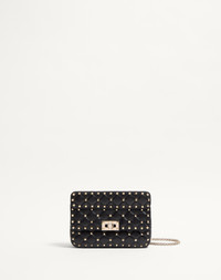 Small Valentino Garavani Rockstud Spike chain bag in supple lambskin Nappa. Quilted construction, embellished with small studs. Equipped with both a detachable sliding chain strap and a detachable handle, this accessory can be worn as a crossbody/shoulder bag or used as a handbag. - Quilted Nappa. Argyle pattern enhanced by tone-on-tone stitching - Platinum-finish studs and hardware - Twist-lock closure - Nappa lining. Interior: open red leather pocket - Dimensions: W20xH11.5xD5 / W7.9xH4.5xD2 in. - Weight: 0.56 Kg / 1.2 lbs - Made in Italy Product code: 7W2B0123NAP_0NO