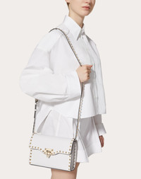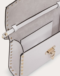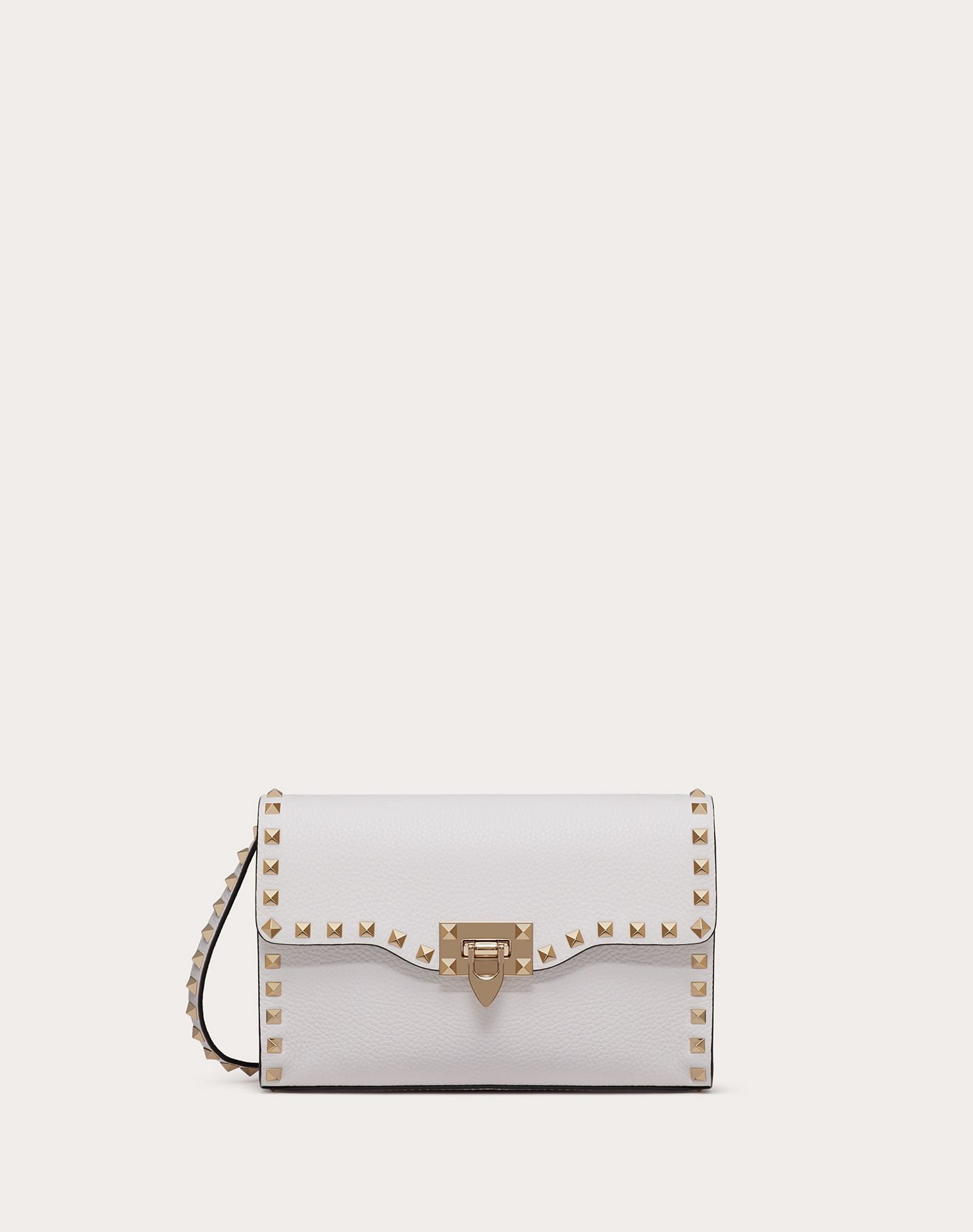 Small Valentino Garavani Rockstud crossbody bag in grainy calfskin leather. - Platinum-finish studs and hardware - Hook closure - Adjustable strap - Cotton lining - Interior: flat open pocket - Dimensions: W22.5xH15xD6 cm / W8.8xH6xD2.3 in - Made in Italy
