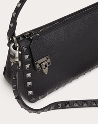 Small Valentino Garavani Rockstud crossbody bag in grainy calfskin leather. The iconic hook closure is reinterpreted to secure the zipper pull. - Ruthenium-finish studs and hardware - Double fastening: zipper and hook - Adjustable and removable strap - Interior: card slot - Shoulder strap drop length: 50 cm / 19.7 in. Dimensions: W19xH13xD7 cm / W7.4xH5.1xD2.7 in. - Made in Italy Product code: 5W0B0J47HAD_0NO