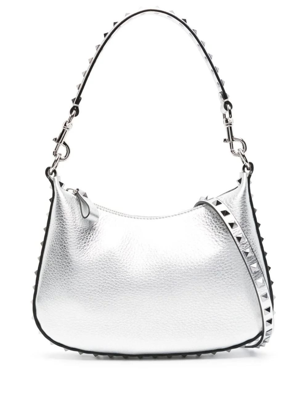 mini Rockstud cross body bag Highlights - Silver-tone - Calf leather - Pebbled texture - Metallic finish - Painted edge - Detachable shoulder strap - Single detachable top handle - Silver-tone rockstud embellishment - Logo stamp to the rear - Main compartment - Internal card slot - Internal logo stamp - Suede lining - Top zip fastening Made in Italy Composition Outer: Calf Leather 100% SIZE & FIT Model measurements Height 5 ft 10 in(1.78 m) Bust/Chest 31.49 in(80 cm) Hips 37 in(94 cm) Waist 23.62 in(60 cm) Measurement DEPTH 2.55 in(6.5 cm) HANDLE 15.35 in(39 cm) HEIGHT 6.29 in(16 cm) STRAP 44.09 in(112 cm)