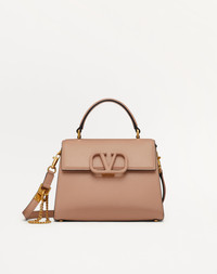 Small Valentino Garavani VSLING grainy calfskin leather handbag with VLogo Signature closure. Equipped with an extendable shoulder strap, this accessory can be worn as a crossbody/shoulder bag, or carried in the hand using the handle. - Antique-brass-finish metal hardware - Magnetic closure with leather-covered logo - Leather shoulder strap with adjustable chain - Protective feet - Nappa lining - Interior: zipper pocket - Dimensions: W22xH17xD9 cm / W8.7xH6.7xD3.5 in. - Made in Italy This product contains magnets. Please consider if this product will be worn within 15 cm from any implanted device. Any concerns please contact your healthcare professional. Product code: 7W2B0F53KGW_GF9