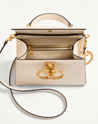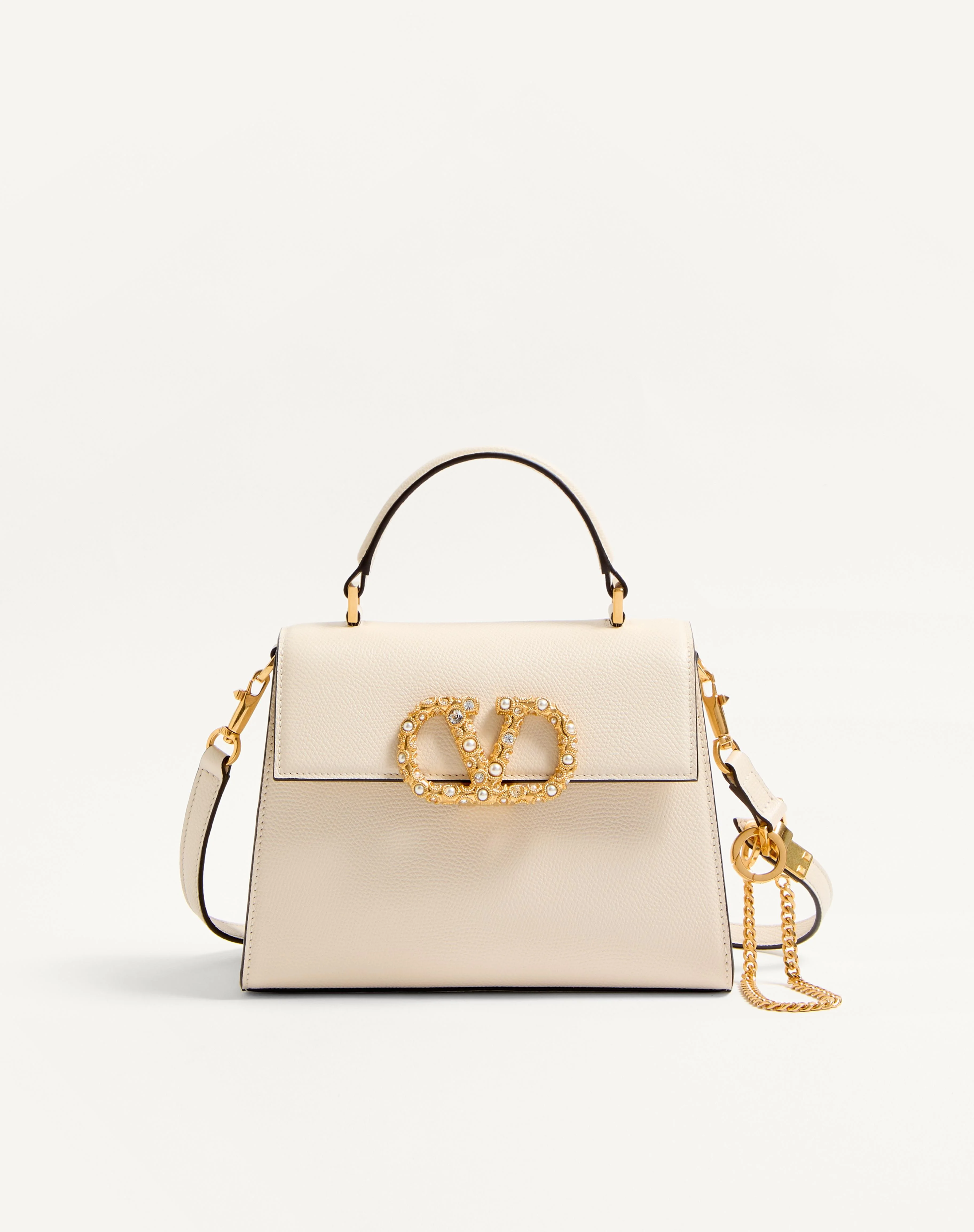 Valentino Garavani VSLING small handbag in grainy calfskin leather with VLogo Signature jewel closure. The bag can be worn on the shoulder/crossbody by using the extendable shoulder strap, or handheld thanks to the handle. - Antique brass-finish hardware - Magnetic closure embellished with synthetic pearls and Swarovski® crystals - Leather shoulder strap with adjustable chain detail - Protective feet - Nappa leather lining. Interior: one zipper pocket Shoulder strap drop length: min. 45 cm to max. 59 cm / min. 17.7 in. to max. 23.2 in. - Dimensions: W22xH17xD9 cm / W8.7xH6.7xD3.5 in. - Made in Italy This product contains magnets. Please consider if this product will be worn within 15 cm from any implanted device. Any concerns please contact your healthcare professional. Product code: 7W2B0F53XPW_DYH