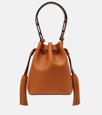 The most established Italian Maison de Couture, Valentino Garavani has become a symbol of excellence, creativity, and uniqueness. Made in Italy from rusty-hued leather and tonal suede lining, the So Seau Small bucket bag is adorned by tassel details and the brand's iconic VLogo. Product Details - Material: leather - Lining: suede - Made in Italy - Designer color name: Nutmeg - Item color: brown - Hardware color: gold - Adjustable top handle - Internal details: single compartment - Closure: drawstring top - Includes: dust bag - Item number: P01094043 Size & Fit - Height 22cm-8.5" - Width 17cm-6.5" - Depth 9,5cm-3.5" - Adjustable shoulder strap - Min. length shoulder strap 69cm-27" - Max. length shoulder strap 42cm-16.5"