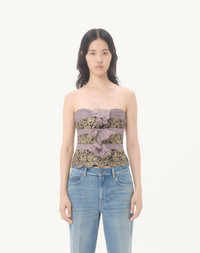 Chiffon top with draping and lace inserts - Sweetheart neckline - Side zipper and hook-and-eye closure - Creponne Chiffon (100% Silk) - Georgette Stretch lining (91% Silk, 9% Elastane) - Length: 55 cm / 21.7 in. from the shoulders in an Italian size 40 - The model is 176 cm / 5'9" tall and wears an Italian size 40 - Made in Italy The look of the model is completed by Valentino Garavani Panthea Shoes. Product code: 7B0AEB309RD_CC2