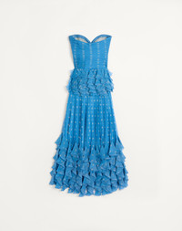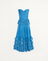 Long dress in Pludepois print chiffon with handmade draping on top - Sweetheart neckline - Ruffle details on waist and bottom - Side zipper closure - Plusdepois Chiffon (100% Silk) - Georgette Stretch Silk lining (91% Silk, 9% Elastane) - Length: 116 cm / 45.6 in. from the waist in an Italian size 40 - The model is 176 cm / 5'9" tall and wears an Italian size 40 - Made in Italy The look of the model is completed by Valentino Garavani Foliefoliage Shoes. Product code: 6B0VDL809C8_DEP