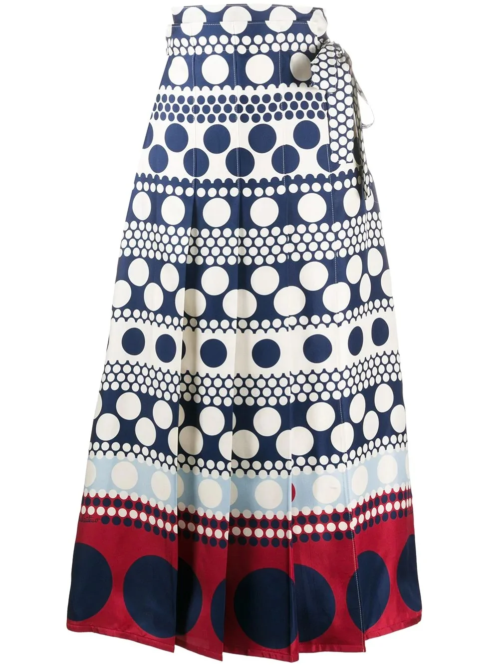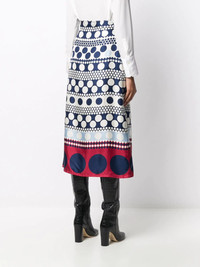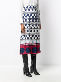 stripe and dot skirt A lot of the time, it's hard to decide between the polka dot or striped pattern. A tiger can't change its stripes; a leopard can't change its spots. Well, Valentino Garavani just made us reconsider everything with this design — why not Highlights - Valentino ready to wear - Navy/red/white - Cotton/silk-blend - High-waisted - Box-pleat detail - Side tie fastening Made in Italy Composition Lining: Viscose 63%, Silk 37% Outer: Cotton 100% SIZE & FIT Model measurements Height 5 ft 10 in(1.79 m) Bust/Chest 32.67 in(83 cm) Hips 35.43 in(90 cm) Waist 25.98 in(66 cm) FittingInformation This piece fits true to size. We recommend you get your regular size Designed to be fitted at the waist and hips, loose over the leg Made with a mid-weight non-stretch fabric Washing instructions Dry Clean Only