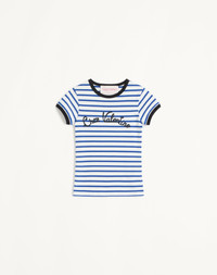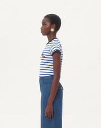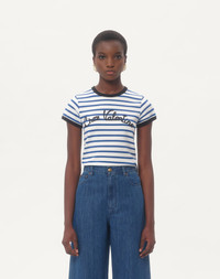 Striped Jersey Cotton T-Shirt - Chez Valentino print - Striped Jersey Cotton (100% Cotton) - Length: 59 cm / 21.6 in. from the shoulders in an Italian size S - Sleeve length: 29 cm / 27.9 in. from the center back in an Italian size S - The model is 176 cm / 5'9" tall and wears an Italian size S - Made in Italy The look of the model is completed by a Valentino Garavani 9TO5 Bag and Valentino Garavani Bay By Bay Shoes. Product code: 6B3MG24P961_CR1