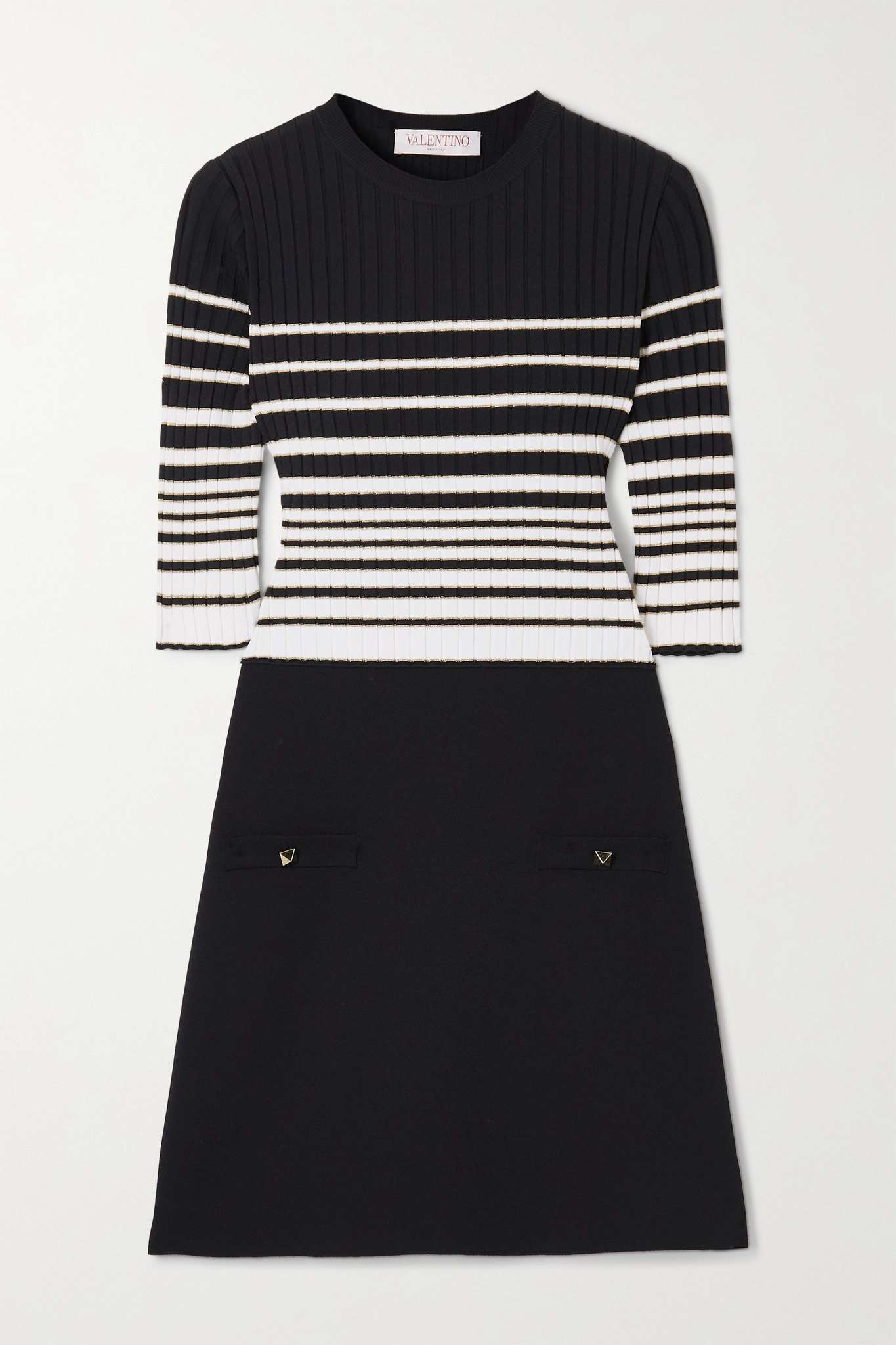 EDITORS'NOTES Valentino Garavani's mini dress exudes a retro Parisian mood with its Breton stripes and mini hem. An ideal investment piece, it's rib-knitted for a close fit through the bodice before unfurling to a flared skirt. Pair yours with ballet pumps to enhance the '60s mood and match your jewelry to the gleaming 'Rockstud' hardware punctuating the slip pockets. SIZE & FIT - Fits true to size, however those who are between sizes should take the smaller size - Designed to be fitted at the bust and waist, slightly loose at the hip - Lightweight knit - Model is 177cm/ 5'10" and is wearing a size XSmall DETAILS & CARE - Black, white and gold ribbed-knit - Slips on - 64% viscose, 20% polyester, 16% metallic fibres - Dry clean