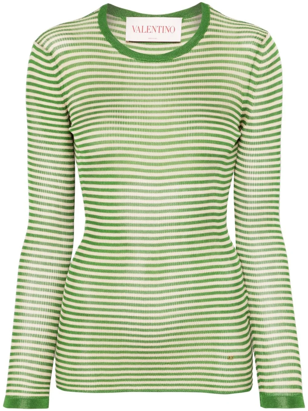 striped sweater Highlights - Valentino ready to wear - Grass green - Crew neck - Long sleeves Made in Italy Composition Silk 100% SIZE & FIT Model measurements Height 5 ft 11 in(1.8 m) Bust/Chest 33.07 in(84 cm) Hips 37.4 in(95 cm) Waist 25.19 in(64 cm) FittingInformation Designed for a slim fit that sits just away from the body offering a close yet comfortable fit Made with a midweight knit, this piece offers some stretch