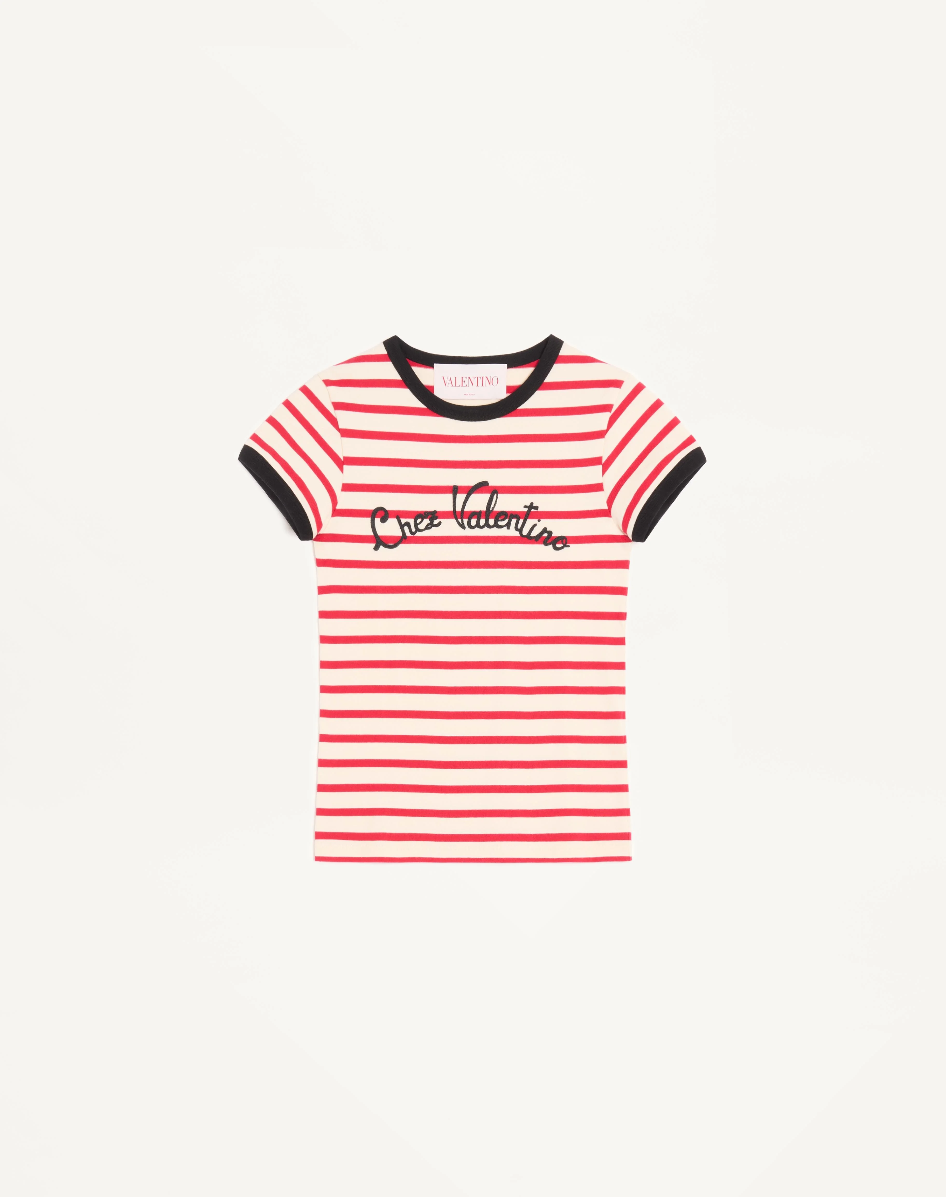 Striped Jersey Cotton T-Shirt - Chez Valentino print - Striped Jersey Cotton (100% Cotton) - Length: 59 cm / 21.6 in. from the shoulders in an Italian size S - Sleeve length: 29 cm / 27.9 in. from the center back in an Italian size S - The model is 176 cm / 5'9" tall and wears an Italian size S - Made in Italy The look of the model is completed by a Valentino Garavani 9TO5 Bag and Valentino Garavani Bay By Bay Shoes. Product code: 6B3MG24P961_AS0