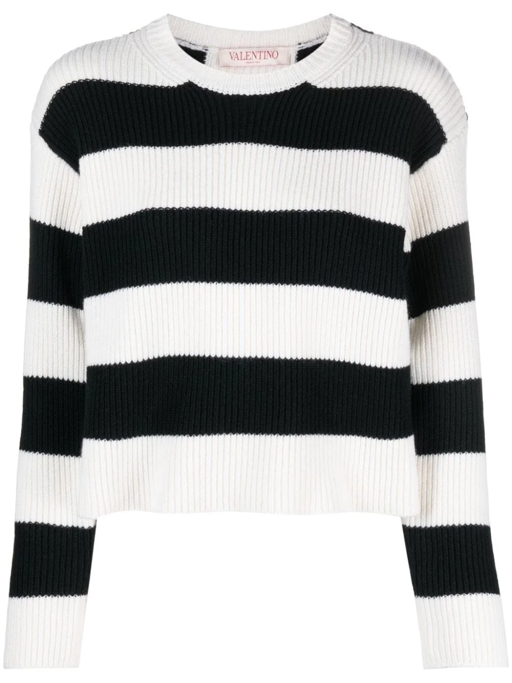 striped virgin wool jumper This black and white Valentino Garavani jumper looks as classic as it gets from the front with its wide horizonal stripes, but it turns to reveal an inverted version of the pattern at the back. Highlights - Valentino ready to wear - Black/white - Virgin wool - Ribbed knit - Horizontal stripe pattern - Vertical stripe pattern - Crew neck - Long sleeves - The full look includes valentino garavani accessories. Made in Italy Composition Virgin Wool 100% SIZE & FIT Model measurements Height 5 ft 10 in(1.78 m) Bust/Chest 33.07 in(84 cm) Hips 36.61 in(93 cm) Waist 24.8 in(63 cm) FittingInformation Designed for a slim fit that sits just away from the body offering a close yet comfortable fit Made with a midweight knit, this piece offers some stretch This piece fits true to size – take your usual size Washing instructions Dry Clean Only