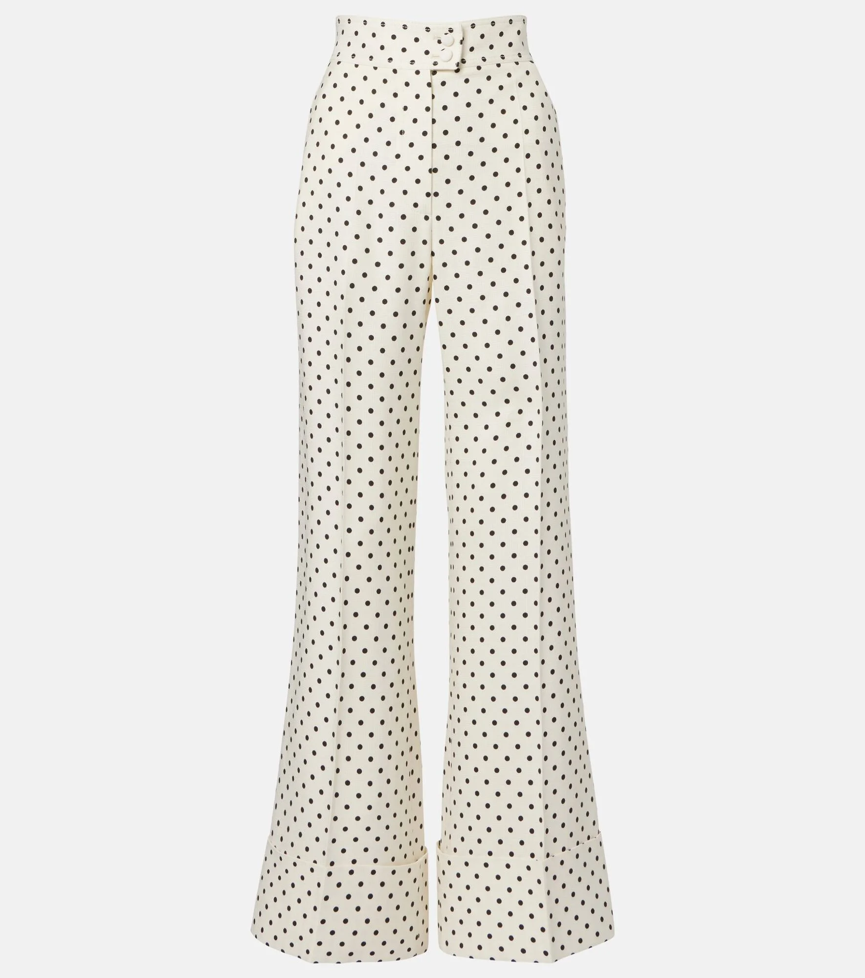 Valentino has become a symbol of crafting excellence, creativity, and uniqueness. Shaped into a pleated, flared-leg silhouette, these pants are decorated with the brand's Supergran Plusdepois polka-dot print. Product Details - Material: 100% viscose - Care instructions: dry clean - Made in Italy - Color: white - Designer color name: Betulla/Nero - Pocket lining: 100% cotton - Pockets: slant pockets, back pockets - Closure: zip and button fastening - Cuff: turnback - Item number: P01108229 Size & Fit - True to size - Non-stretchy fabric - Wide-leg - High-waisted - The model seen in the picture is 178cm-5'10" and wearing a size IT 40