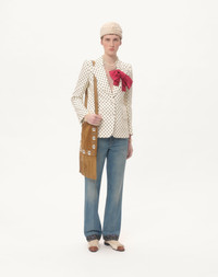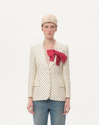 Supergran Plusdepois print jacket with Double Douchesse bow detail - Single breasted - Side pockets - Passementerie detail on the inside - Front button closure - Supergran Plusdepois (100% Viscose) - Crepe de Chine lining in diagonal stripe V Logo (75% Acetate, 25% Silk) - Length: 66.5 cm / 26.2 in. from the shoulders in an Italian size 40 - The model is 176 cm / 5'9" tall and wears an Italian size 40 - Made in Italy The look of the model is completed by a Valentino Garavani Vain Bag and Valentino Garavani Foliefoliage Shoes. Product code: 6B0CE46598S_R8E