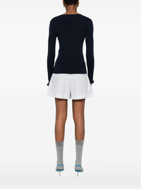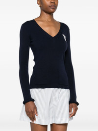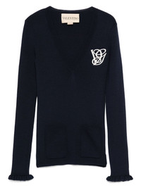 ruffled V-neck wool sweater Highlights - Valentino ready to wear - Navy blue - V-neck - Ruffled cuffs - Embroidered logo - Patch pockets - Long sleeves Made in Italy Composition Virgin Wool 100%, Acrylic 50%, Wool 50% SIZE & FIT Model measurements Height 5 ft 11 in(1.8 m) Bust/Chest 31.49 in(80 cm) Hips 36.61 in(93 cm) Waist 24.4 in(62 cm) Washing instructions Dry Clean Only