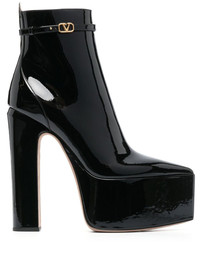 Tan-Go patent platform boots Defined by a 155mm block heel, these Valentino Garavani boots are set atop a statement platform sole. The black patent design is accented with a VLogo buckle at the ankle for a branded completion. Made in Italy Composition Lining: Calf Leather 100% Sole: Calf Leather 100% Outer: Patent Calf Leather 100% SIZE & FIT Measurement CIRCUMFERENCE 7.87 in(20 cm) HEEL 6.1 in(15.5 cm) HEIGHT 5.31 in(13.5 cm) Sole height 2.55 in(6.5 cm)