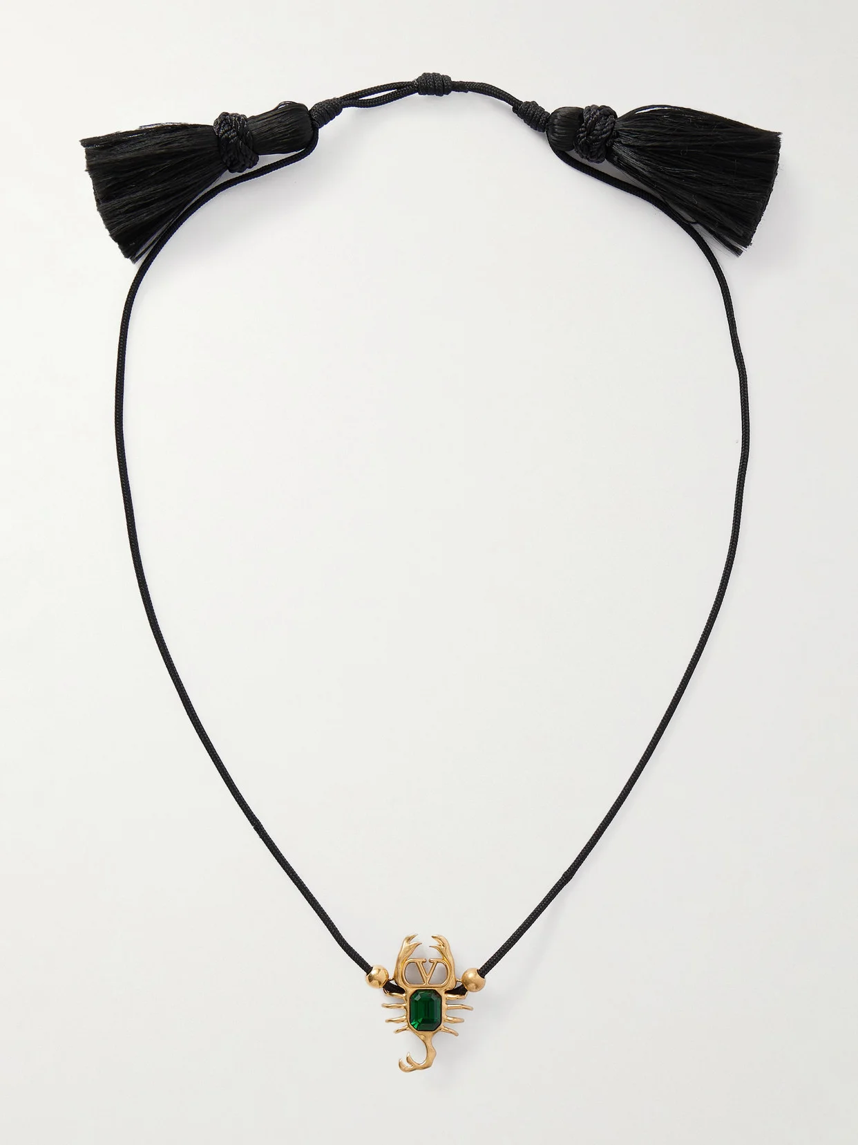 Valentino Garavani's headpiece has a gold-tone scorpion charm with the brand's 'VLogo' and a sparkling green gemstone. It's strung on a slim, adjustable cord with swishy tassels at the ends.