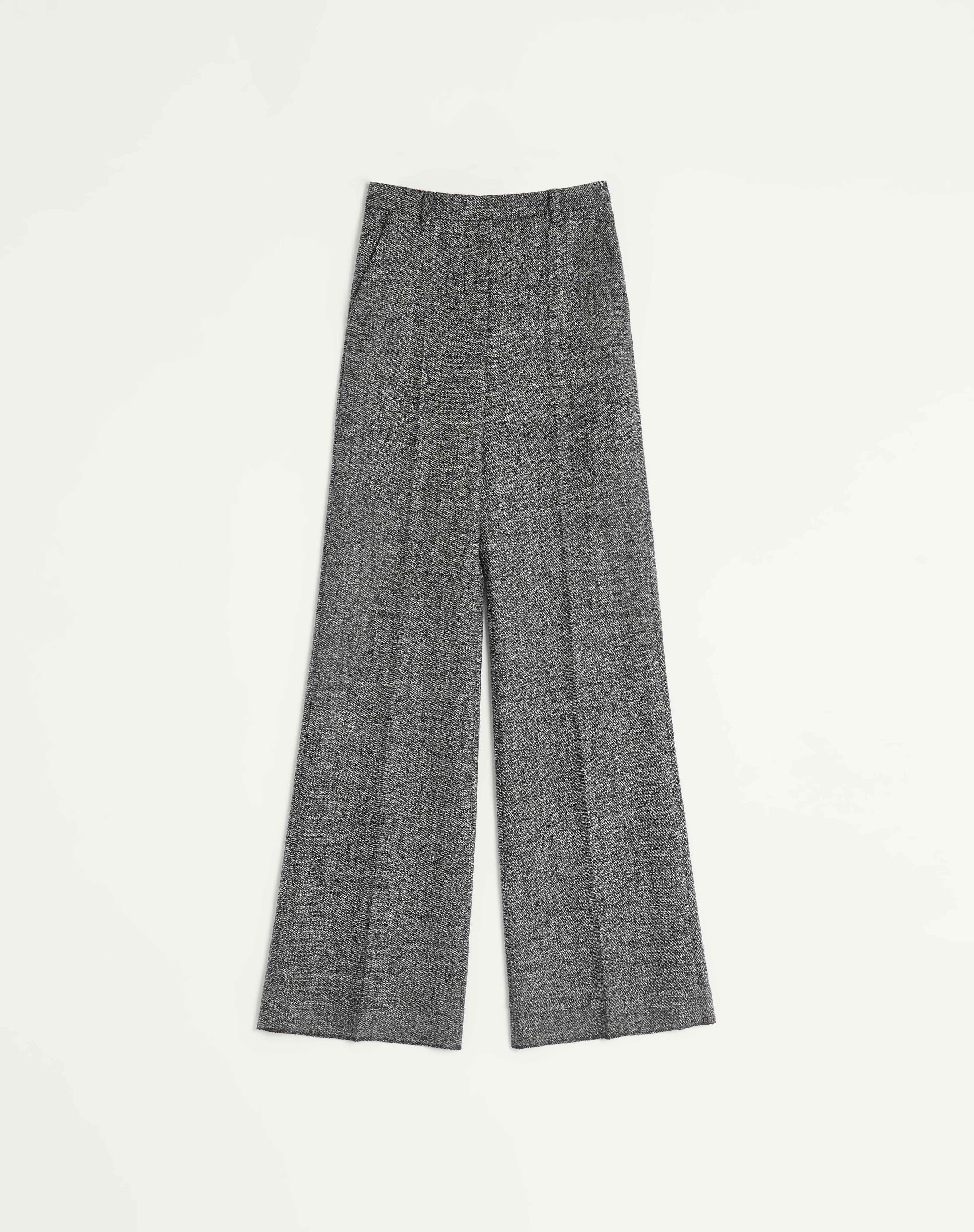Wool Mouline palazzo pants with frayed hem - Front button and zipper closure - Wool Mouline (100% Virgin Wool) - Half lining in cotton (100% Cotton) - Length: 125 cm / 49.2 in. from the waist in an Italian size 40 - Leg opening: 33 cm / 12.9 in. in an Italian size 40 - The model is 176 cm / 5'9" tall and wears an Italian size 40 - Made in Italy The look of the model is completed by a Valentino Garavani Minaumorphe Bag and Valentino Garavani Shoes. Product code: 7B0RB6S09UR_A01