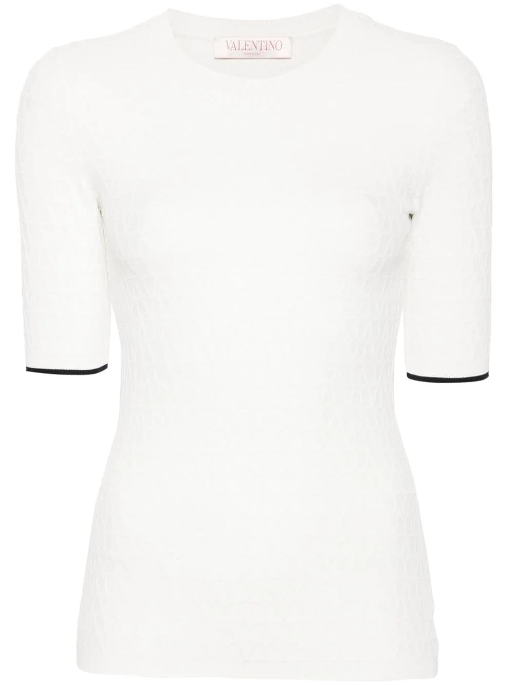 Toile Iconographe top Highlights - Valentino ready to wear - White - Knitted construction - Toile iconographe jacquard - Ribbed trim - Crew neck - Short sleeves - Contrasting border - Straight hem Made in Italy Composition Viscose 70%, Polyester 16%, Polyamide 10%, Elastane 4% Washing instructions Dry Clean Only