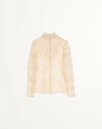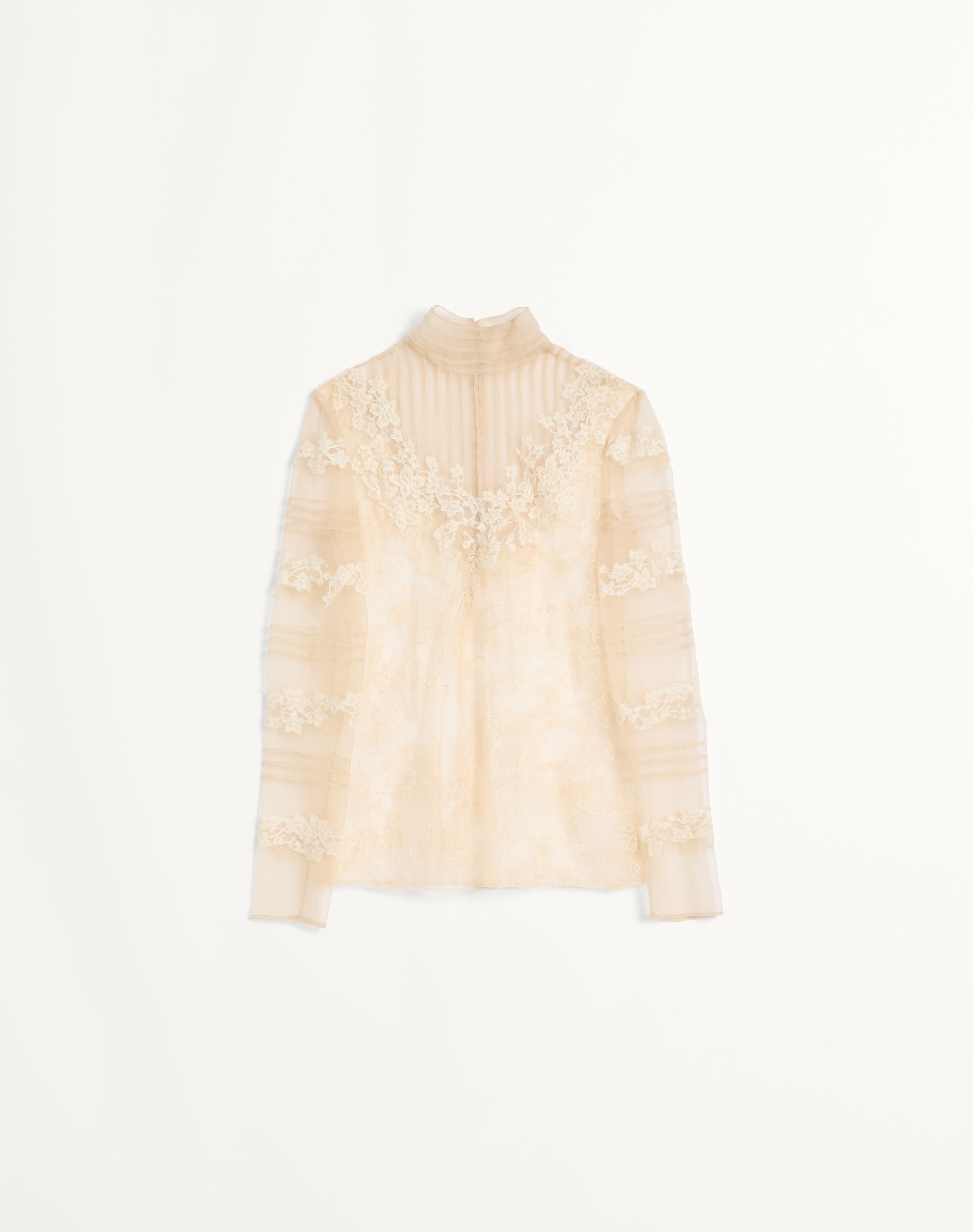 Dentelle top with Roses motif - Pintuck detail on plastron - Lace inlay embroidery - Rear closure with zipper and covered buttons - Roses Dentelle (72% Polyamide, 28% Viscose) - Lining under top - Length: 62.5 cm / 24.6 in. from the shoulders in an Italian size 40 - Sleeve length: 80 cm / 31.5 in. from the center back in an Italian size 40 - The model is 176 cm / 5'9" tall and wears an Italian size 40 - Made in Italy The look of the model is completed by a Valentino Garavani 9TO5 Bag and Valentino Garavani Pattie Shoes. Product code: 6B3AEAF0928_0X2