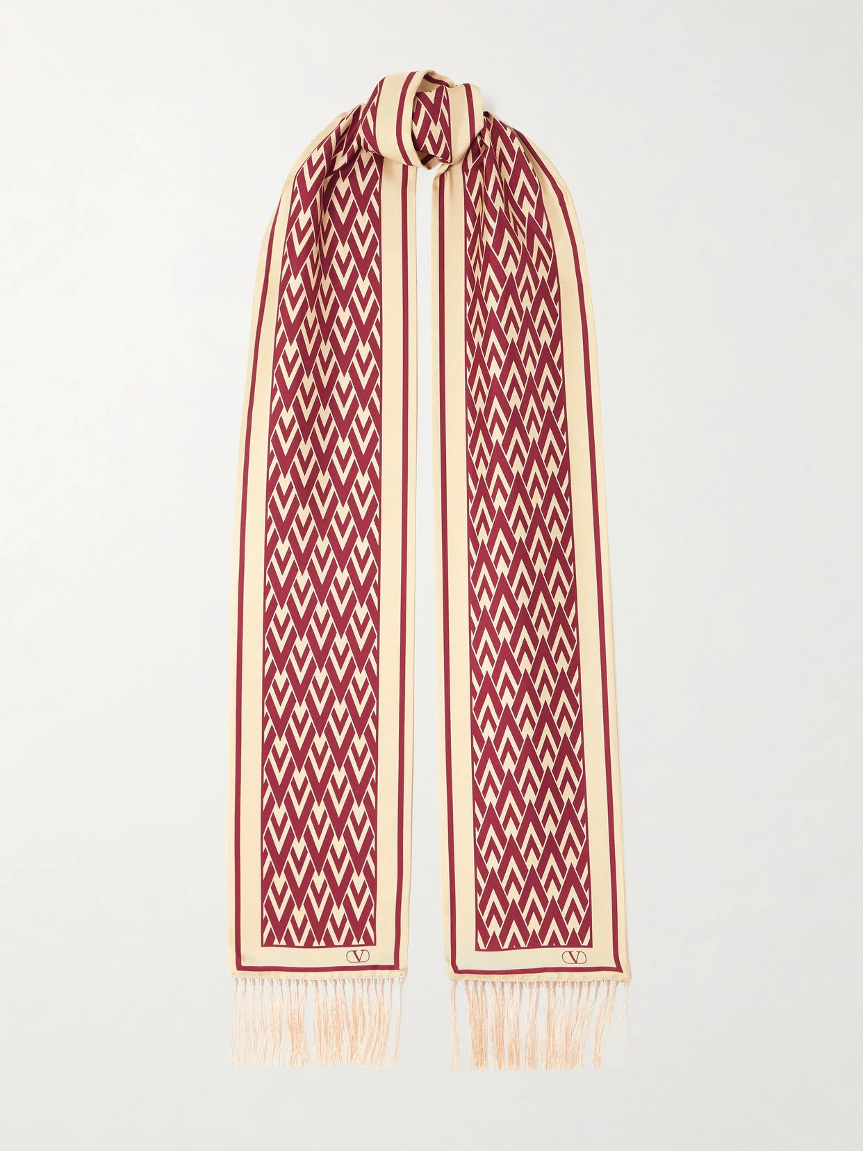 Valentino Garavani's scarf is made from lustrous silk-twill and printed with the label's 'Toute La V' motif in a vintage-inspired palette. The ends are tipped with knotted fringing.