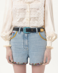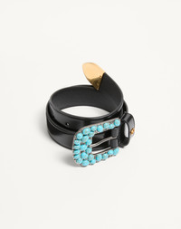 Valentino Garavani VLogo Signature belt in brushed calfskin leather. - Rounded buckle decorated with paste gemstones, loop with VLogo Signature detail, and metal tip - Buckle with antique silver finish - VLogo Signature detail and tip with antique brass finish - Brushed calfskin exterior - Calfskin interior - Dimensions: H. 30 mm / 1.2 in. - Made in Italy Product code: 7W2T0SQ2EQV_0NO