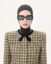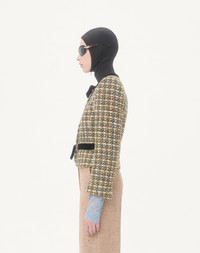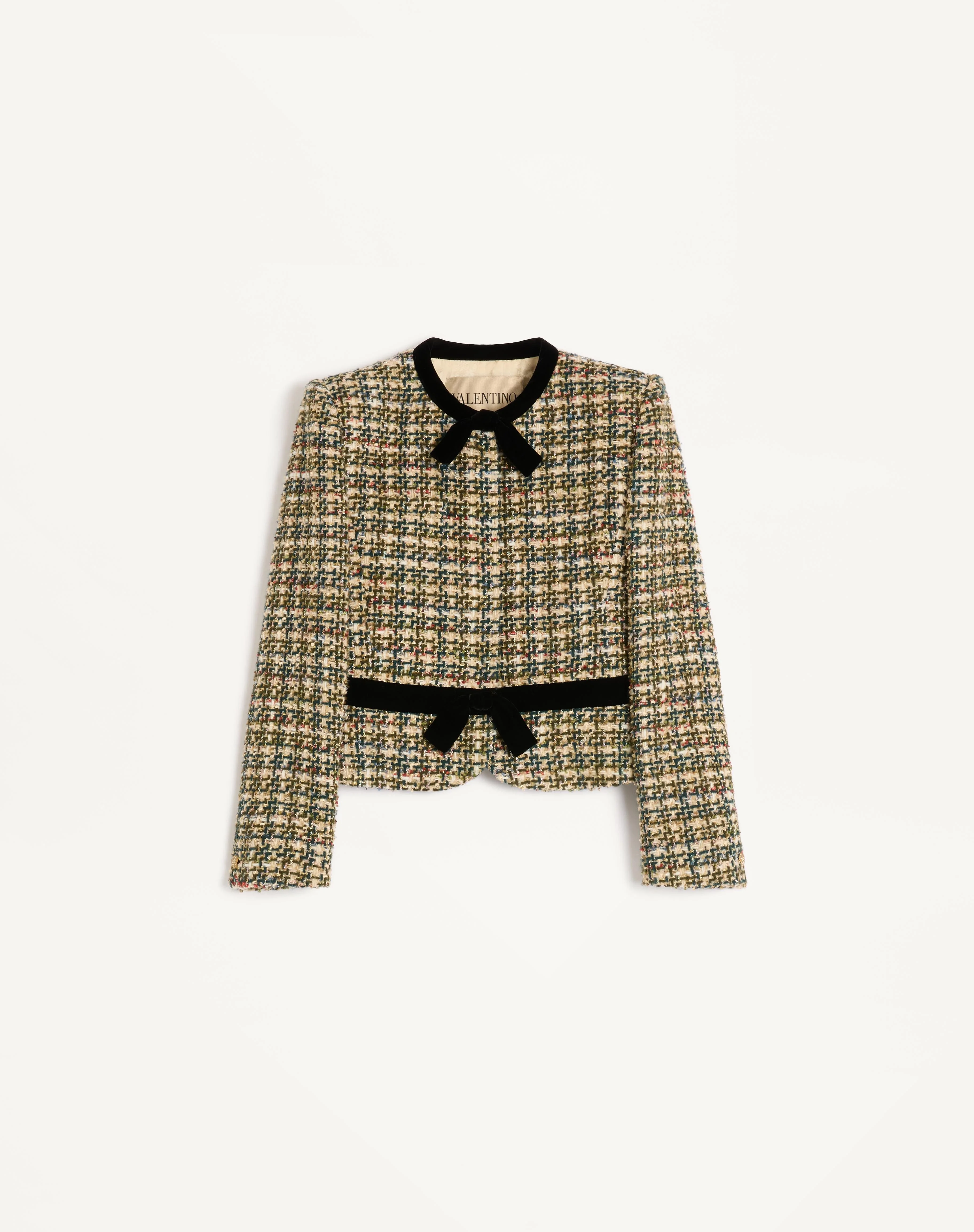 Tweed jacket with velvet details - Shoulder pads - Front snap button closure - Multicolor Tweed (33% Polyamide, 31% Acrylic, 31% Wool, 5% Polyester) - VLogo Jacquard Flower Lining (75% Acetate, 25% Silk) - Length: 51 cm / 20.1 in. from the shoulders in an Italian size 40 - The model is 176 cm / 5'9" tall and wears an Italian size 40 - Made in Italy The look of the model is completed by a Valentino Garavani Vain Bag and Valentino Garavani Shoes. Product code: 7B0CE4T09R6_M12