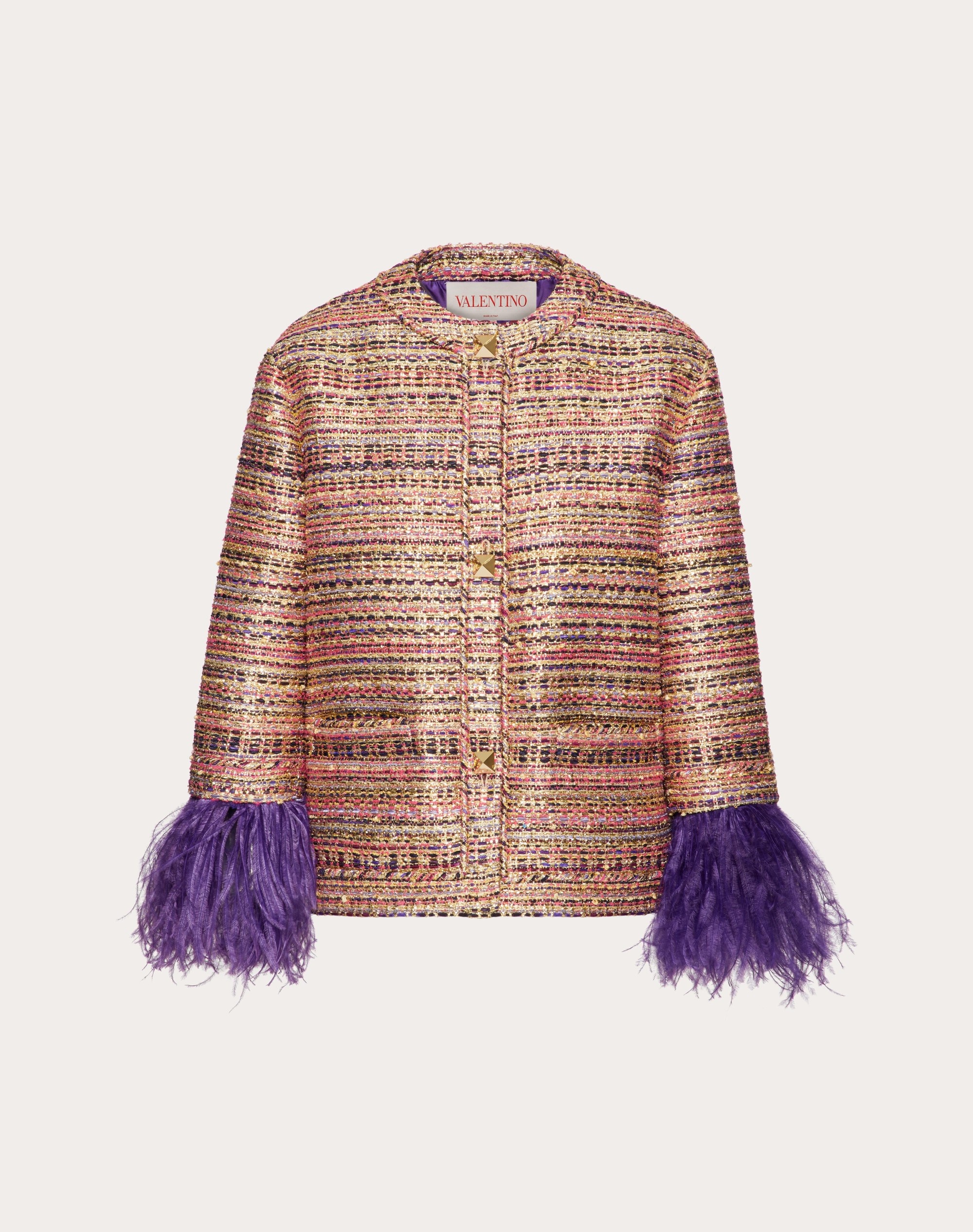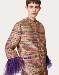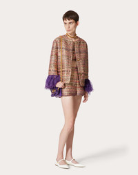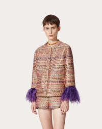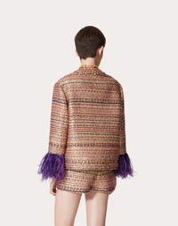 Tweed Party Jacket With Feathers - Feather embroidery at the wrists - Front press stud fastening - Tweed Party (42% Polyamide, 19% Polyester, 18% Metallic Fiber, 8% Cotton, 6% Cupro, 4% Acrylic, 2% Wool, 1 % Viscose) - Habotai lining (100% Silk) - Length: 60 cm / 23.6 in. from shoulders in Italian size 40 - Sleeve length: 65 cm / 25.6 in. from center back in Italian size 40 - The model is 176 cm / 5'9" tall and wears an Italian size 40 - Made in Italy Product code: BCE3457LT_YT2