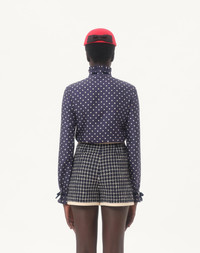 Twill shirt with Plus De Pois print - Ruffle detail on collar and cuffs - Velvet bow detail - Front button closure - Plus De Pois Twill (100% Silk) - Length: 60 cm / 23.6 in. from the shoulders in an Italian 40 - The model is 176 cm / 5'9" tall and wears an Italian size 40 - Made in Italy The look of the model is completed by a Valentino Garavani Vain Bag and Valentino Garavani Adamantine Shoes. Product code: 7B3AB7U79ML_0W6