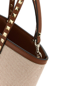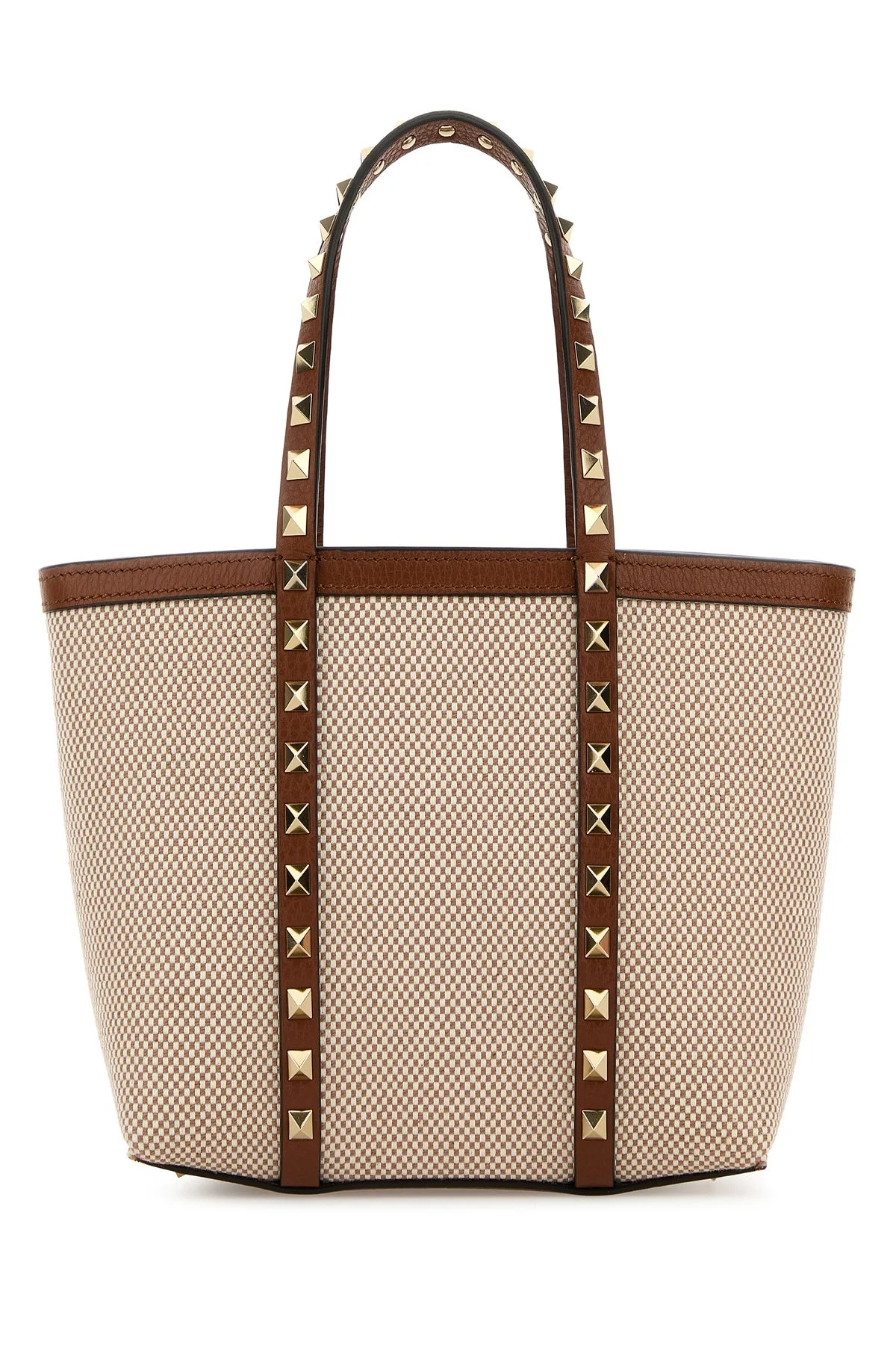 Handbag realized in canvas with pebble calf leather inserts enriched by metal studs on the trimmings. - Two leather flat handles with metal studs - Adjustable detachable leather shoulder strap - Zip closure - Split leather interior - Protective metal feet at the base DETAILS Two-tone canvas medium Rockstud handbag Exterior: 100% Fabric 100% Calf Lining: 100% Leather Finishing: Platinum Made in italy Width: 20 cm Height: 16 cm Depth: 7 cm Handle height: 12 cm Min shoulder strap length: 50 cm Max shoulder strap length: 55 cm
