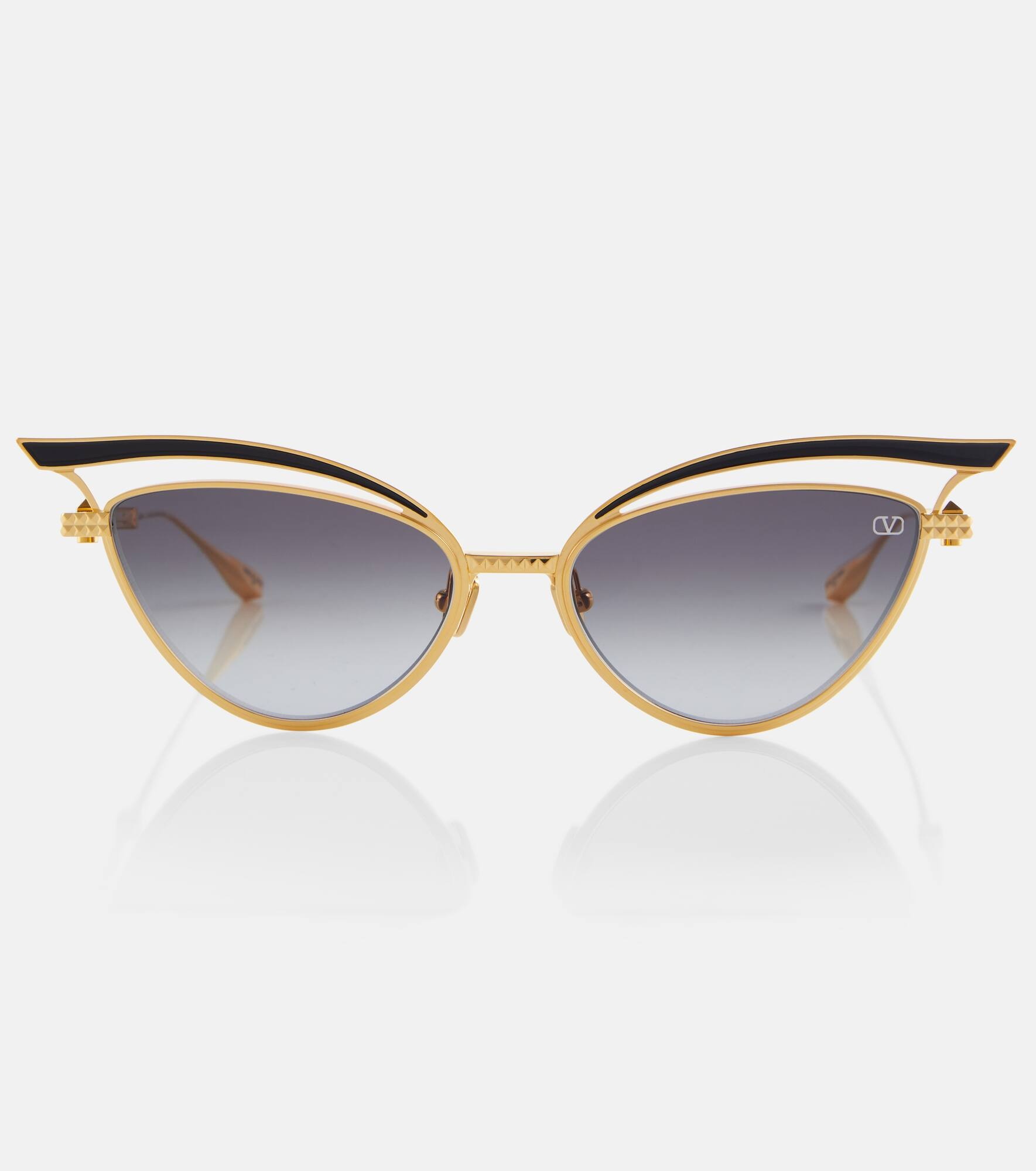 Bring a surrealist touch to your eyewear edit with Valentino's V-Glassliner cat-eye sunglasses. The style features a double-layered rim and Rockstud embellishments at the temples. Product Details - Frame color: gold - Frame material: acetate - Lens color: black - comes in a case, comes in a hard case, comes with a presentation box - The color of the case may vary - Lens filter category 3 - Made in Japan - Item number: P00827401 Size & Fit - Lens width: 55mm-2.15" - Bridge size: 17mm-0.65" - Earpiece length: 142mm-5.6"