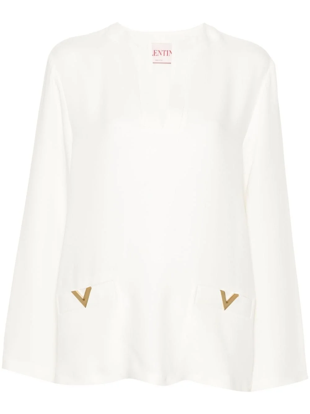 V logo-plaque silk tunic Highlights - Ivory white - Silk - Georgette crepe - Signature v logo plaque - V-neck - Long sleeves - Two faux front welt pockets - Straight hem Made in Italy Composition Silk 100% SIZE & FIT Model measurements Height 5 ft 10 in(1.77 m) Bust/Chest 32.28 in(82 cm) Hips 35.03 in(89 cm) Waist 25.19 in(64 cm) FittingInformation Designed to be unstructured, offering a loose fit throughout Made from a midweight non-stretch fabric This piece fits true to size – take your usual size