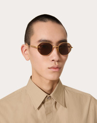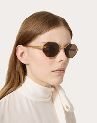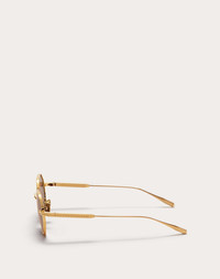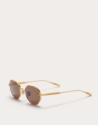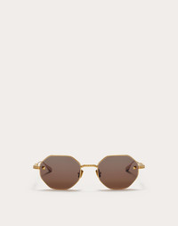 Exhagonal Titanium Frame V-STUD Originated by an oneiric landscape, permeated by grace and inclusivity, the VALENTINO EYEWEAR COLLECTION reaffirms the choice of authenticity and the maison’s Couture legacy, throughout the Japanese craftsmanship. FEATURES - Exhagonal brown titanium shape embellished with yellow gold 3D studs on the bridge and end pieces. - Iconic temple with three-dimensional stud pattern and extruded stud in the temple tip. RFID chip on left bottom temple tip. - Ceramic metal plated with beta titanium nose pad V-logo pressed on the nose pads. - Dark brown 4 base lens, high contrast CR-39. Category 3. - 100% UV Protection. - Prescription friendly. - Unisex Sunglasses. - Handcrafted in Japan. PACKAGING Recycled leather case with strap and cleaning cloth MEASUREMENTS Temples Lenght: 14 cm / 5.5 in Frame total width: 14.5 cm / 5.7 in Lens width: 5.2 cm / 2 in Lens height: 3.5 cm / 1.3 in Bridge: 2,1 cm / 0.8 in Product code: Z530VLS122C_7TX