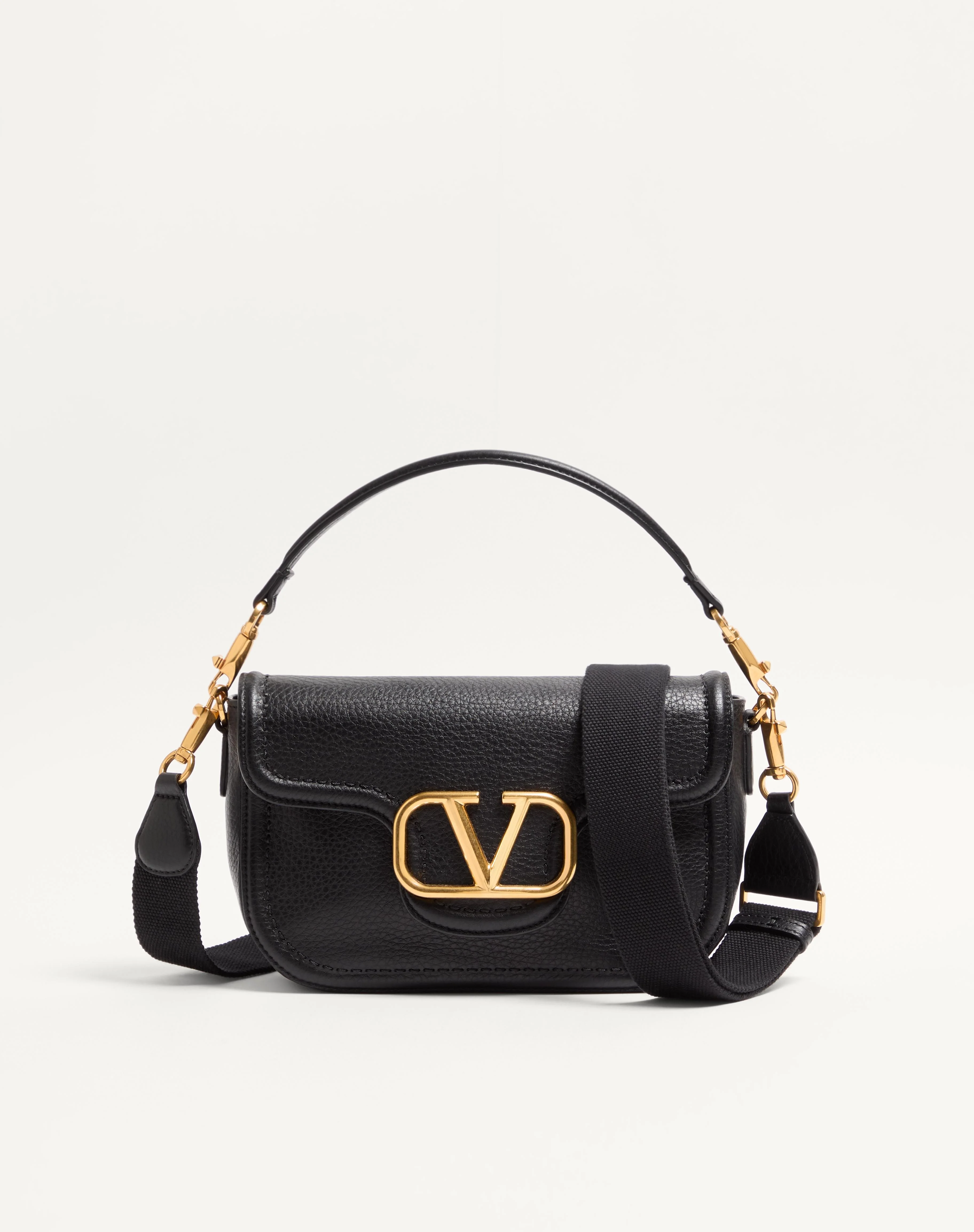 Valentino Garavani Alltime shoulder bag in soft grainy calfskin leather with metallic VLogo Signature detail. The bag can be worn on the shoulder/cross-body or handheld thanks to the removable handle and removable ribbon shoulder strap. Antique brass-finish hardware - Magnetic closure - Removable leather handle - Adjustable and removable fabric shoulder strap Dimensions: W23.5xH18xD8 cm / W9.3xH7xD2.8 in. - Made in Italy This product contains magnets. Please consider if this product will be worn within 15 cm from any implanted device. Any concerns please contact your healthcare professional. Product code: 6W2B0N20IMZ_0NO