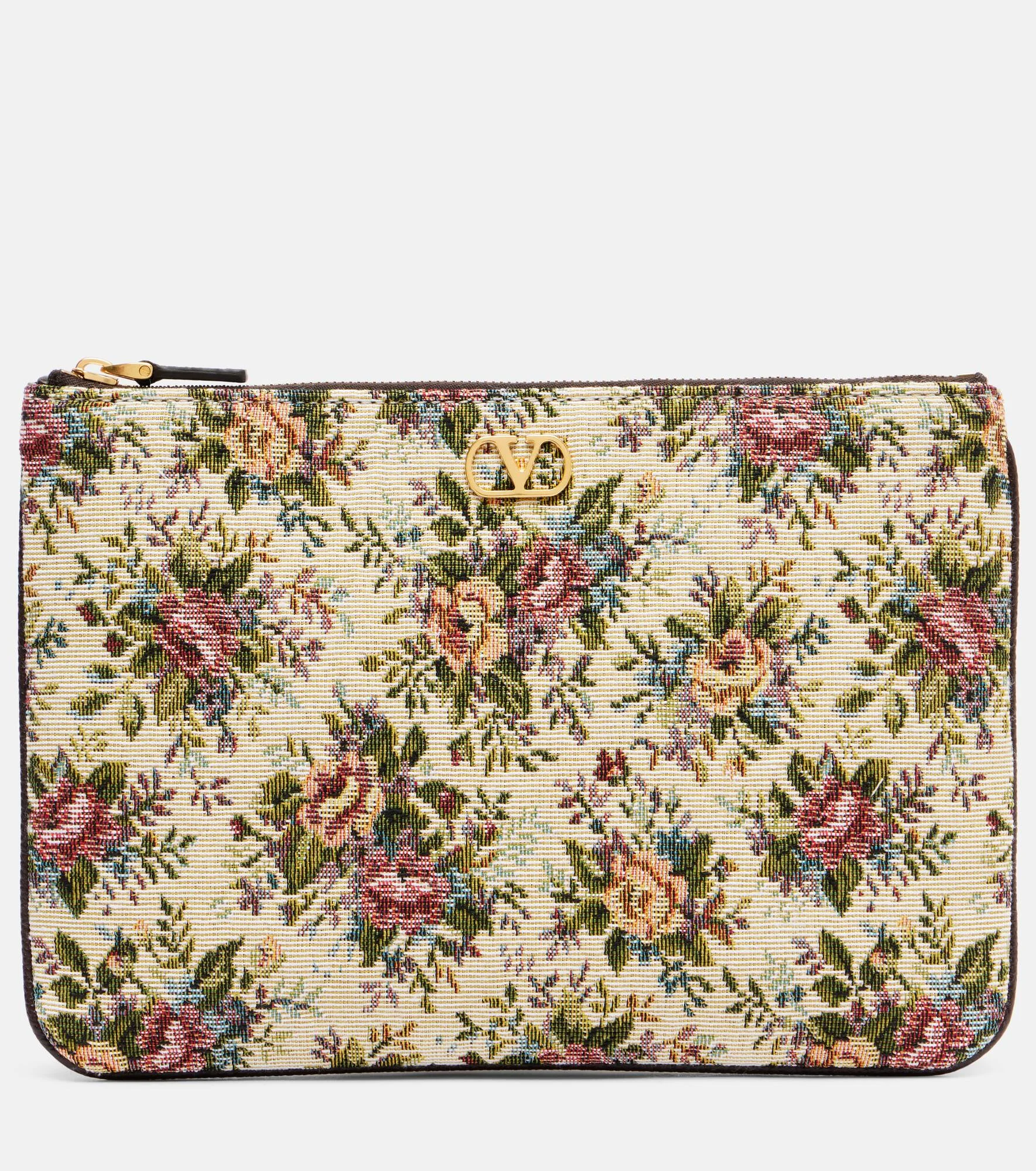 The Valentino Garavani VLogo Signature pouch is crafted from floral jacquard with a refined texture. The compact silhouette is finished with the iconic logo detail, offering a subtle nod to the house’s heritage. Product Details - Material: fabric - Lining: leather - Made in Italy - Designer color name: Multicolor/Oak Brown - Item color: multicolor - Hardware color: gold - Closure: zipped top - Internal details: Card slots - Includes: dust bag, box - Item number: P01056417 Size & Fit - Clutch height 16cm-6.5" - Clutch width 23cm-9"