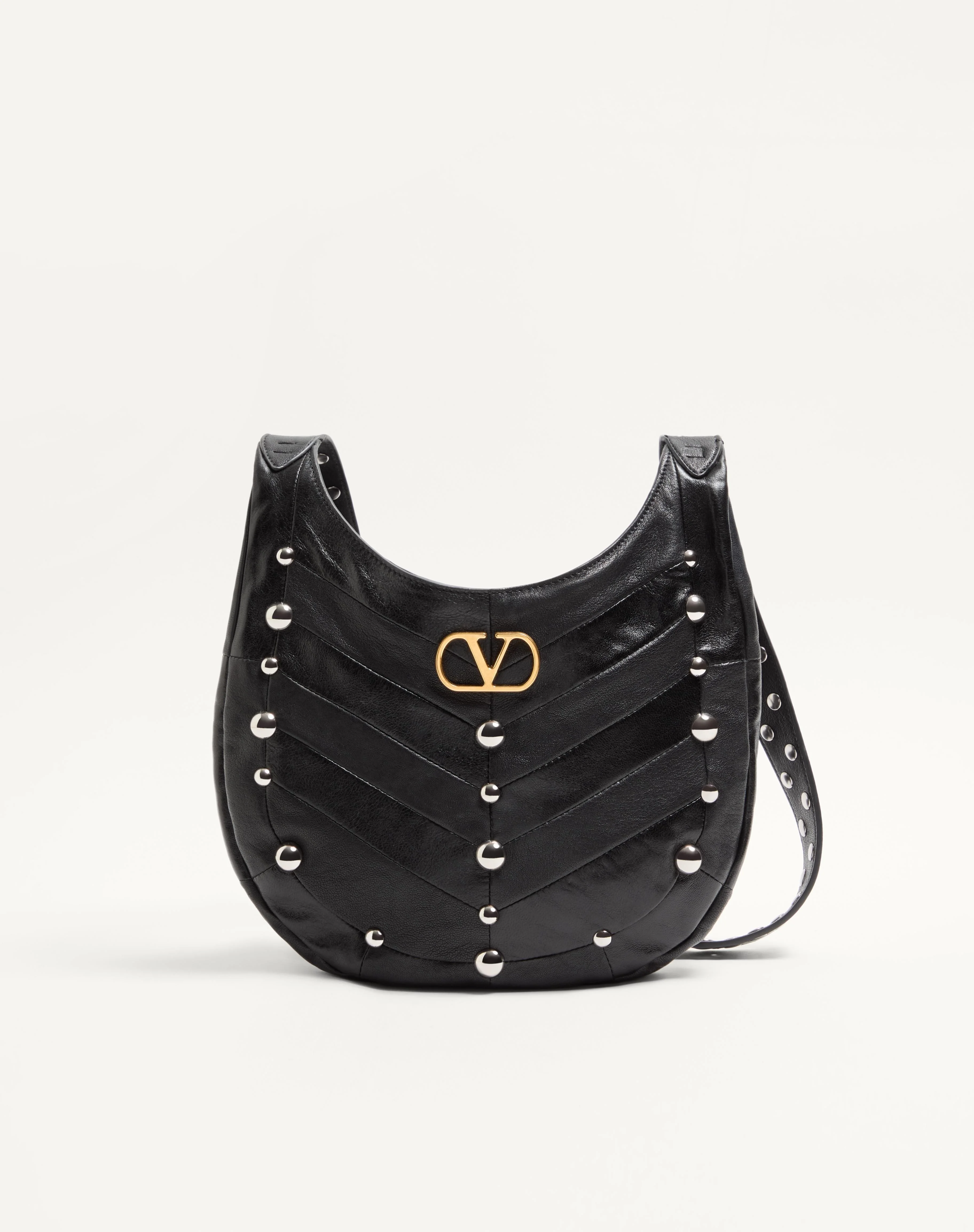 Valentino Garavani Hoboho small hobo bag with patchwork in shiny and matte nappa leather with chevron pattern and studs. VLogo Signature metal feature in antique brass finish. The bag can be worn on the shoulder or crossbody thanks to the adjustable shoulder strap. - Adjustable leather shoulder strap decorated with palladium-finish studs - Shoulder strap drop length: 34 cm / 13.4 in. at the center hole - This model features an additional leather shoulder strap section that can be attached to the bag with buckles - Shoulder strap drop length with additional section: 46 cm / 18.1 in. at the center hole - Nappa leather lining - Dimensions: W28xH21.5xD3 cm / W11xH8.5xD1.2 in. - Made in Italy Product code: 7W0B0S63PXJ_0NO