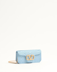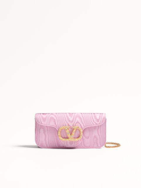 Valentino Garavani Loco clutch in moire fabric with VLogo Signature jewel detail. The bag can be worn on the shoulder/crossbody thanks to the fabric shoulder strap and removable chain. - Antique brass finish metal parts - Magnetic closure decorated with Swarovski® - Adjustable and removable fabric shoulder strap - Shoulder strap with removable chain - Moire fabric lining. Interior: one slip pocket - Shoulder strap drop length: 55 cm / 21.7 in. Dimensions: W21xH10xD5 cm / W8.3xH3.9xD2.0 in. - Made in Italy This product contains magnets. Please consider if this product will be worn within 15 cm from any implanted device. Any concerns please contact your healthcare professional. Product code: 6W2B0R24LDG_D4S