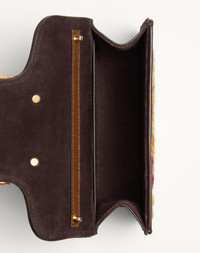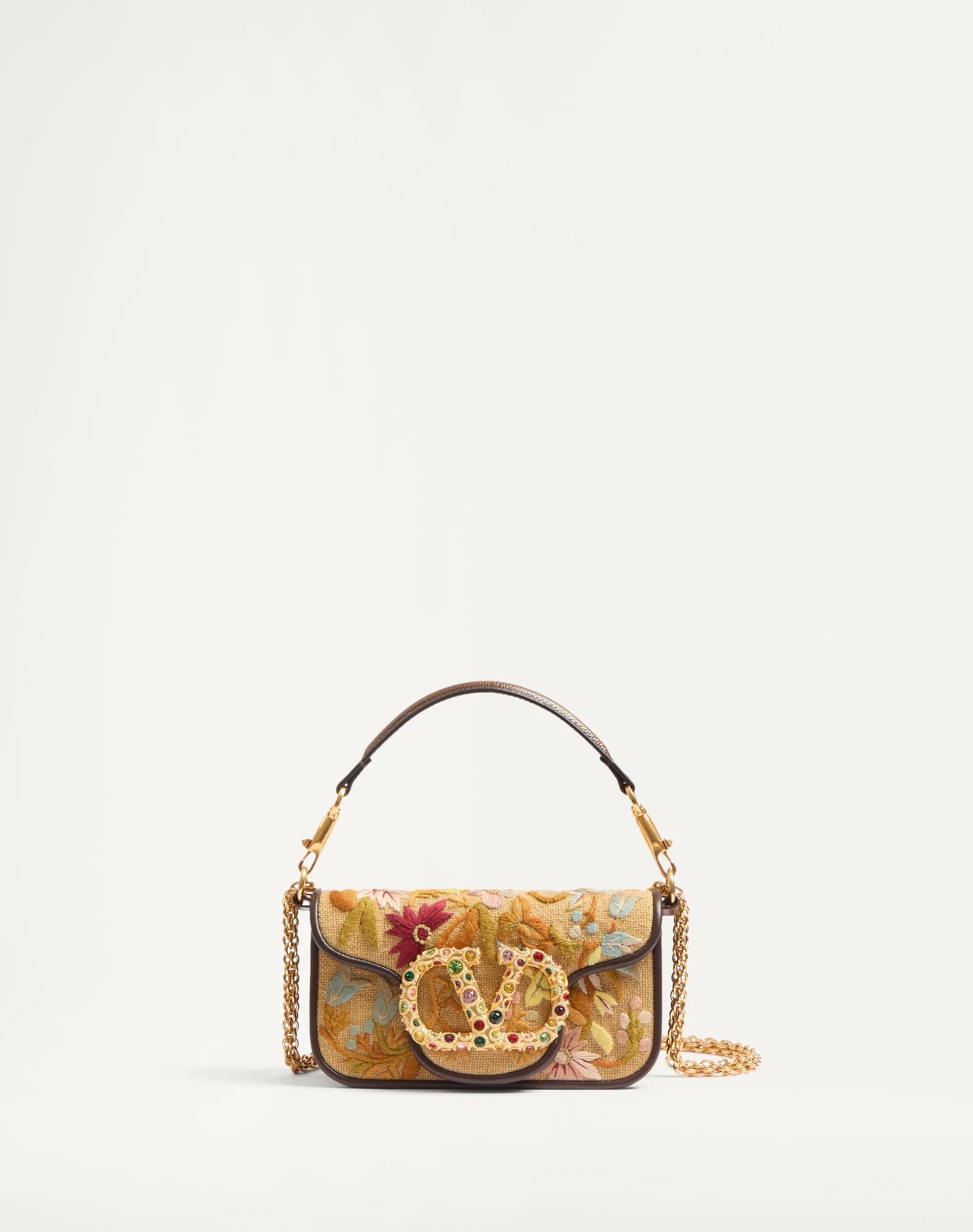 Valentino Garavani Loco small shoulder bag embroidered with floral pattern, karung details and jeweled VLogo Signature feature. Equipped with both a detachable sliding chain and a detachable handle, this accessory can be worn as a crossbody/shoulder bag or carried as a handbag. - Antique brass-finish hardware - Magnetic closure decorated with Swarovski® - Removable karung handle - Shoulder strap with removable sliding chain - Suede lining. Interior: one slip pocket - Shoulder strap drop length: min. 33 cm to max. 55 cm / min. 13.0 in. to max. 21.7 in. - Dimensions: W20xH11xD5 cm / W7.9xH4.3xD2.0 in. - Made in Italy This product contains magnets. Please consider if this product will be worn within 15 cm from any implanted device. Any concerns please contact your healthcare professional. Product code: 6W2B0K53LBI_QX8