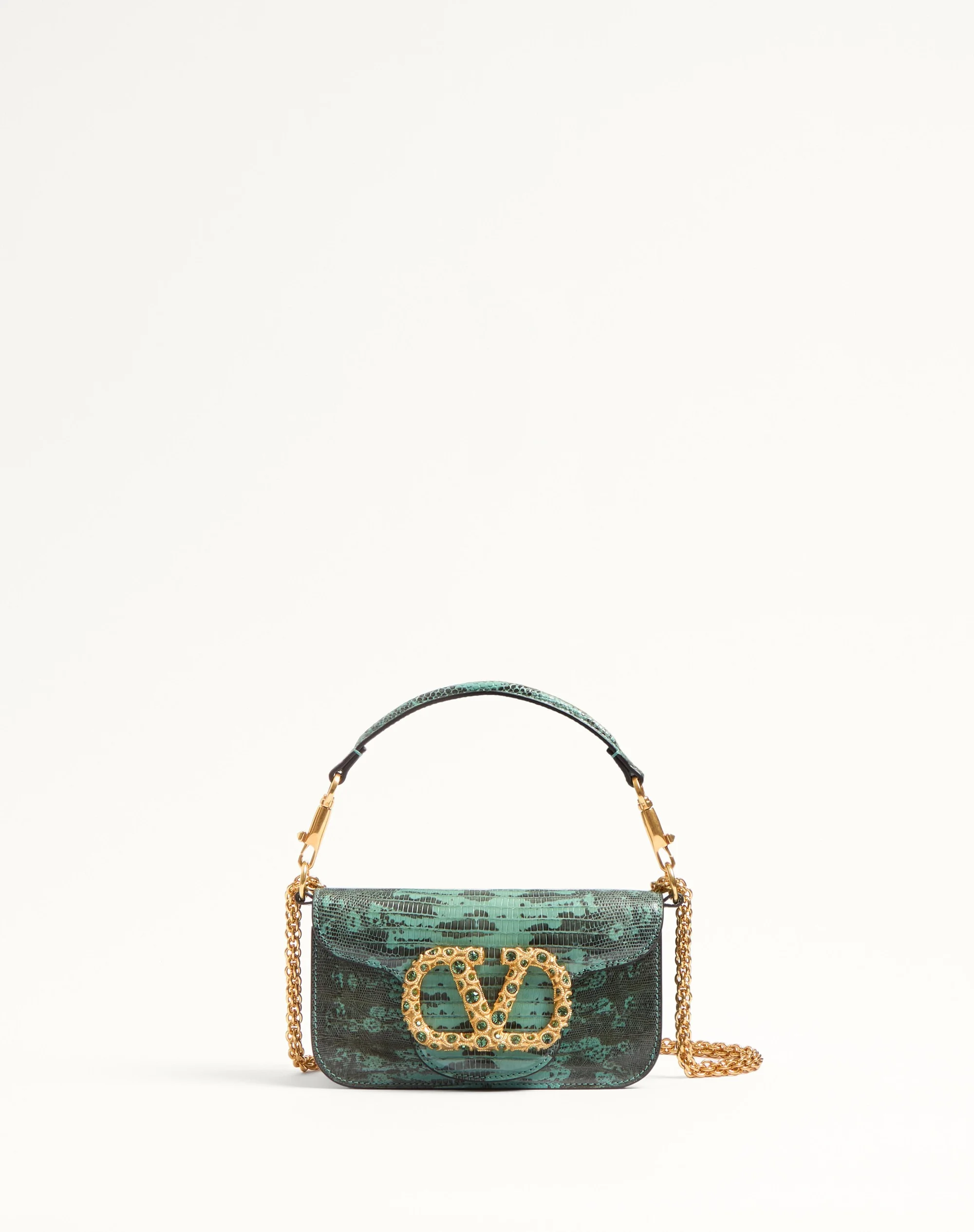 Valentino Garavani Loco small shoulder bag in tejus with VLogo Signature jewel element. Equipped with both a detachable sliding chain and a detachable handle, this accessory can be worn as a crossbody/shoulder bag or carried as a handbag. - Antique brass-finish hardware - Magnetic closure - Removable leather handle - Shoulder strap with removable sliding chain - Nappa leather lining. Interior: one slip pocket Shoulder strap drop length: min. 33 cm to max. 55 cm / min. 13.0 in. to max. 21.7 in. - Dimensions: W20xH11xD5 cm / W7.9xH4.3xD2.0 in. - Made in Italy This product contains magnets. Please consider if this product will be worn within 15 cm from any implanted device. Any concerns please contact your healthcare professional. Product code: 6W2B0K53SLH_R6C