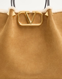 Valentino Garavani medium shopping bag in suede with sheepskin lining, featuring metal VLogo Signature. The shoulder strap features two iconic maxi studs at the ends. - Studs and hardware in antique brass finish - Removable interior pouch - Removable leather shoulder strap - Protective feet - Shoulder strap drop length: 40 cm / 15.7 in. - Dimensions: W35xH25xD17 cm / W13.8xH9.8xD6.7 in. - Made in Italy Product code: 7W0B0R44UVT_A8G