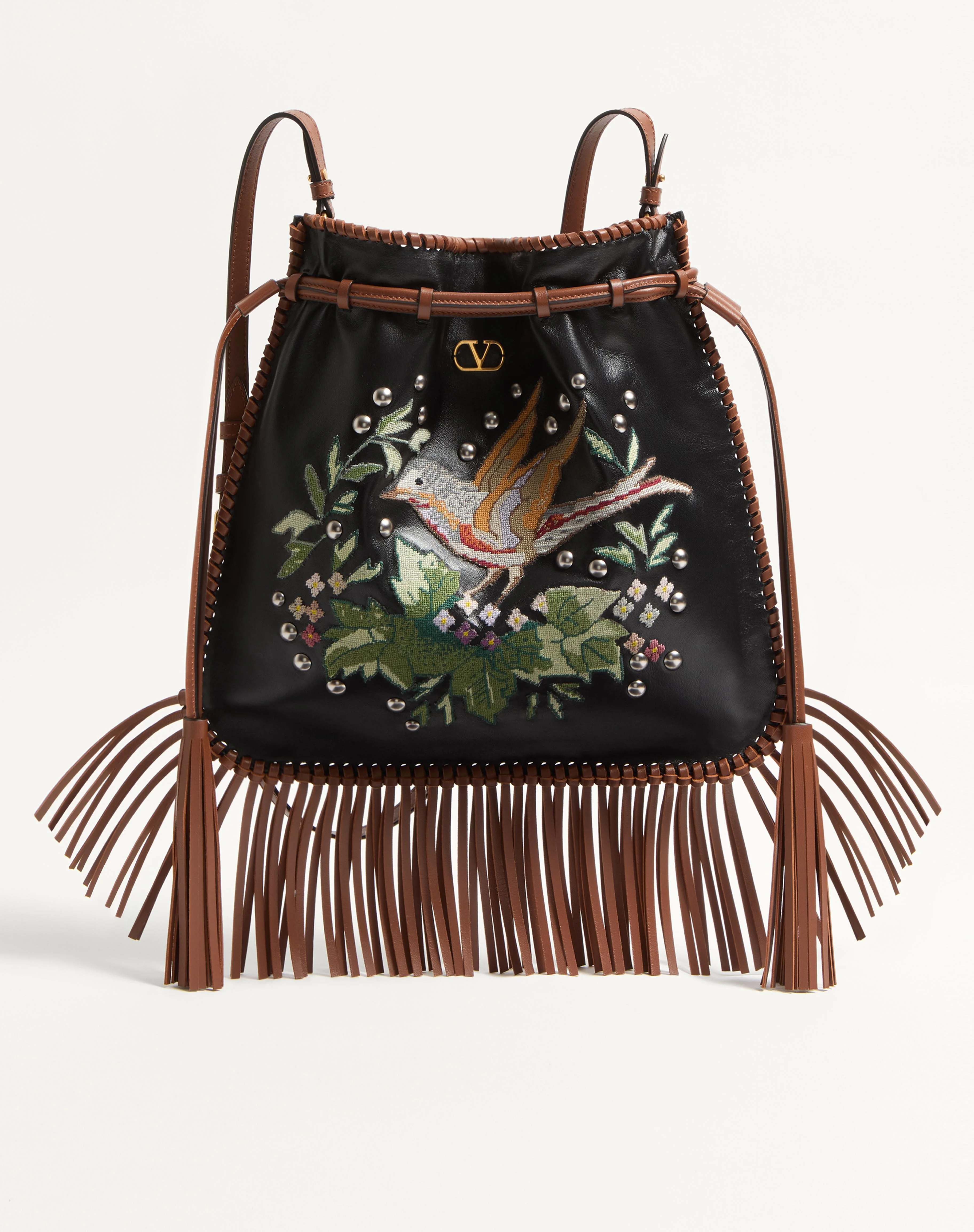 Valentino Garavani Nellcote Alice embroidered leather bag detailed with small studs and fringes. The bag can be carried on the shoulder/cross-body thanks to the adjustable shoulder strap. - Hardware in antique brass finish - Small metallic detail with VLogo Signature - Nappa leather lining - Adjustable and removable leather shoulder strap - Shoulder strap drop length: 55 cm / 21.7 in. at the center hole - Dimensions: W35xH33xD3 cm / W13.7xH12.9xD1.2 in. - Made in Italy Product code: 6W0B0R67UPQ_AUS
