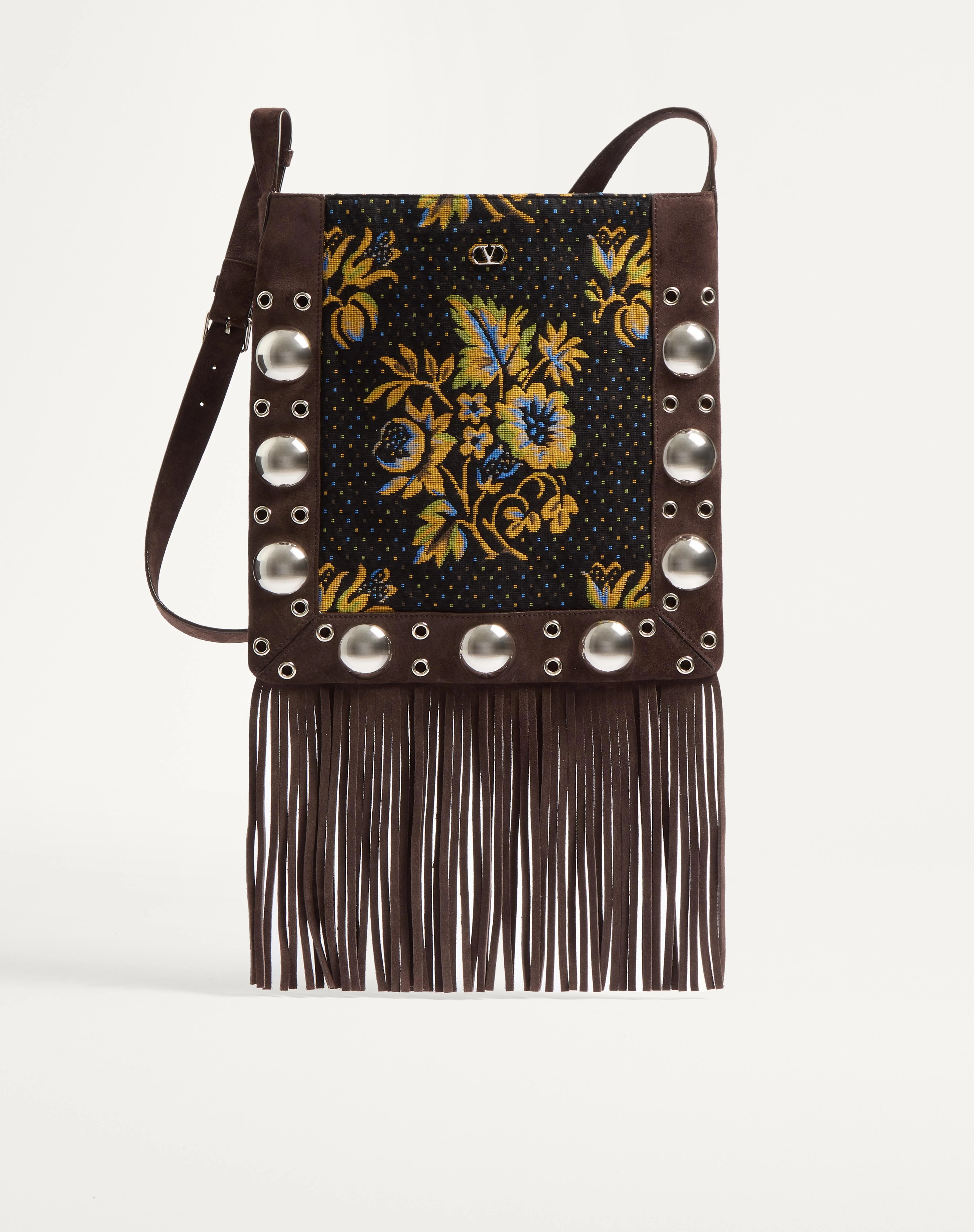 Valentino Garavani Nellcote shoulder bag in jacquard fabric with floral pattern and fringes. Suede trim decorated with ball studs and rivets. The bag can be comfortably worn on the shoulder/crossbody thanks to the adjustable suede shoulder strap. - Palladium-finish hardware - Small metallic detail with VLogo Signature - Shoulder strap drop length: 45 cm / 17.7 in. at the center hole - Dimensions: W30xH31xD3 cm / W11.8xH12.2xD1.2 in. - Made in Italy Product code: 6Y2B0D06ZIS_RCB