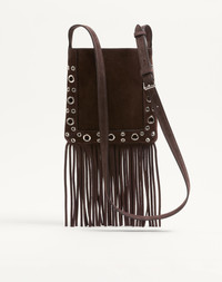 Valentino Garavani Nellcote small shoulder bag in suede with fringes and trim decorated with ball studs and rivets. The bag can be comfortably worn on the shoulder/crossbody thanks to the adjustable suede shoulder strap. - Palladium-finish hardware - Small metallic detail with VLogo Signature - Shoulder strap drop length: 45 cm / 17.7 in. at the center hole - Dimensions: W20xH20xD3 cm / W7.8xH7.8xD1.2 in. - Made in Italy Product code: 6W2B0R34JET_0TO