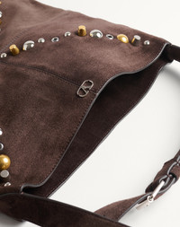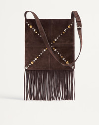 Valentino Garavani Nellcote small shoulder bag in suede with fringes and studs in various shapes and sizes. The bag can be comfortably worn on the shoulder/crossbody thanks to the adjustable suede shoulder strap. - Palladium and gold finish hardware - Small metallic detail with VLogo Signature - Shoulder strap drop length: 45 cm / 17.7 in. at the center hole - Dimensions: W30xH31xD3 cm / W11.8xH12.2xD1.2 in. - Made in Italy Product code: 6W2B0R31ADG_0TO
